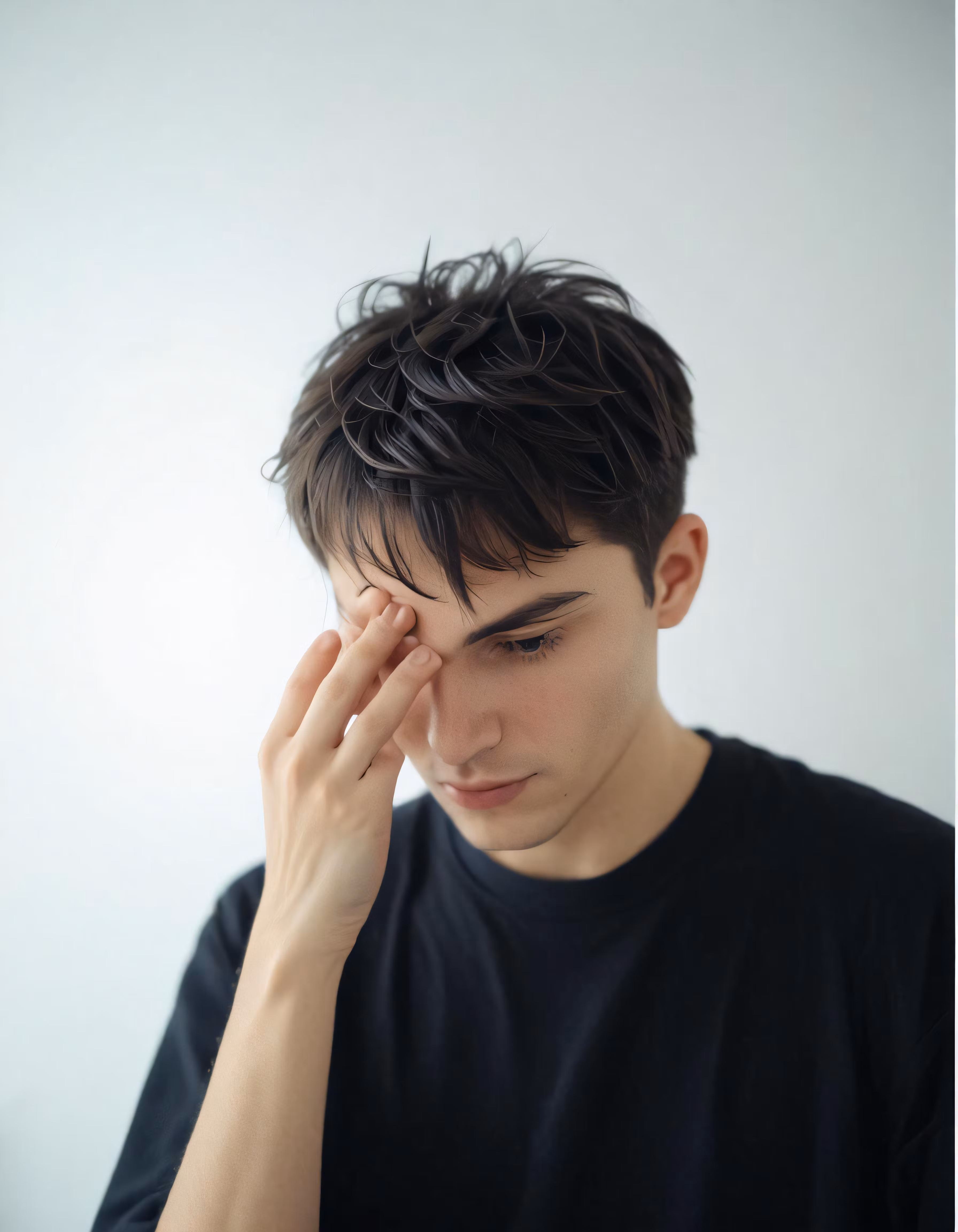 High resolution picture, free to use, a boy looks at his cell phone while holding his head
