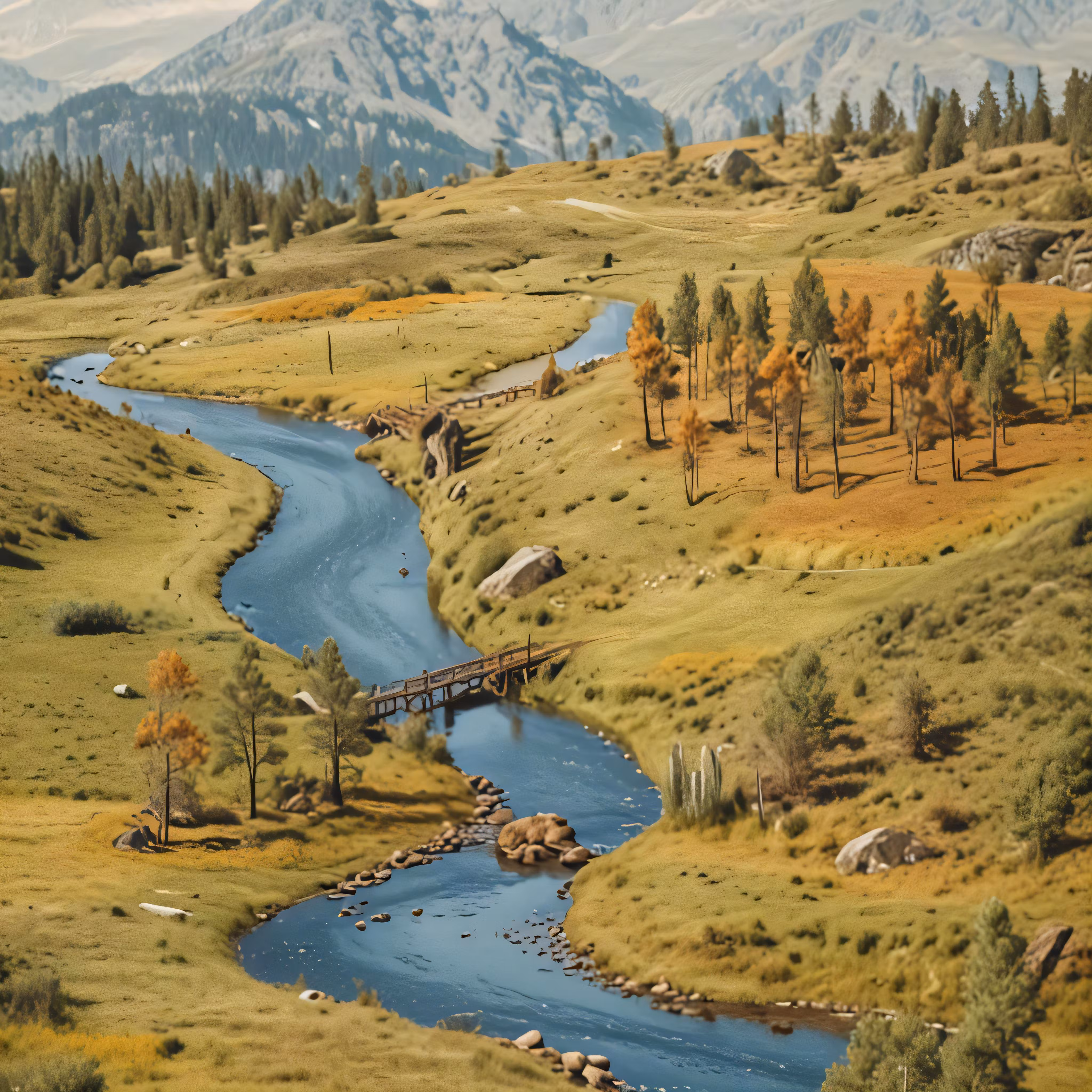 High resolution picture, free to use, a bridge over a stream in a grassy field