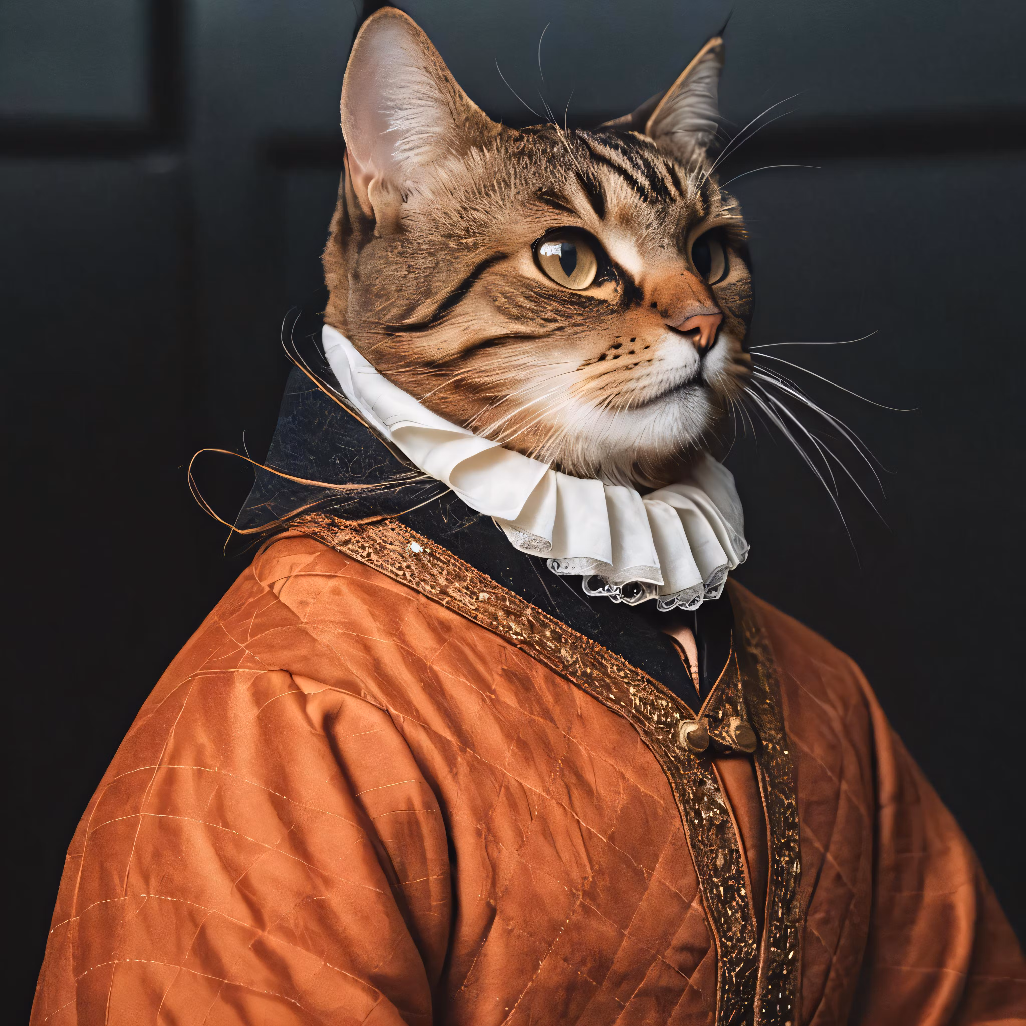 High resolution picture, free to use, a brown and black cat dressed in an orange shirt