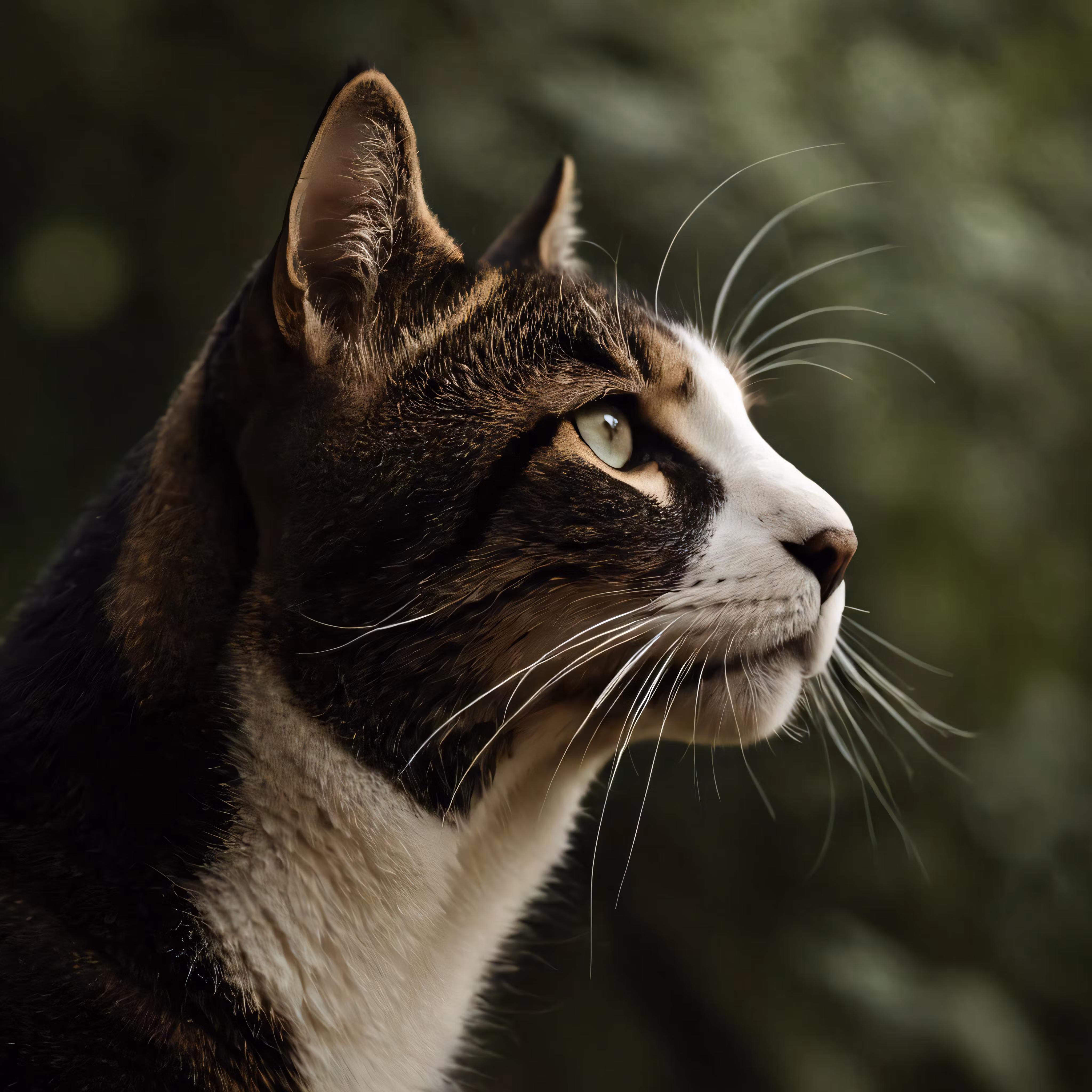 High resolution picture, free to use, a brown and white cat staring intently towards the sky