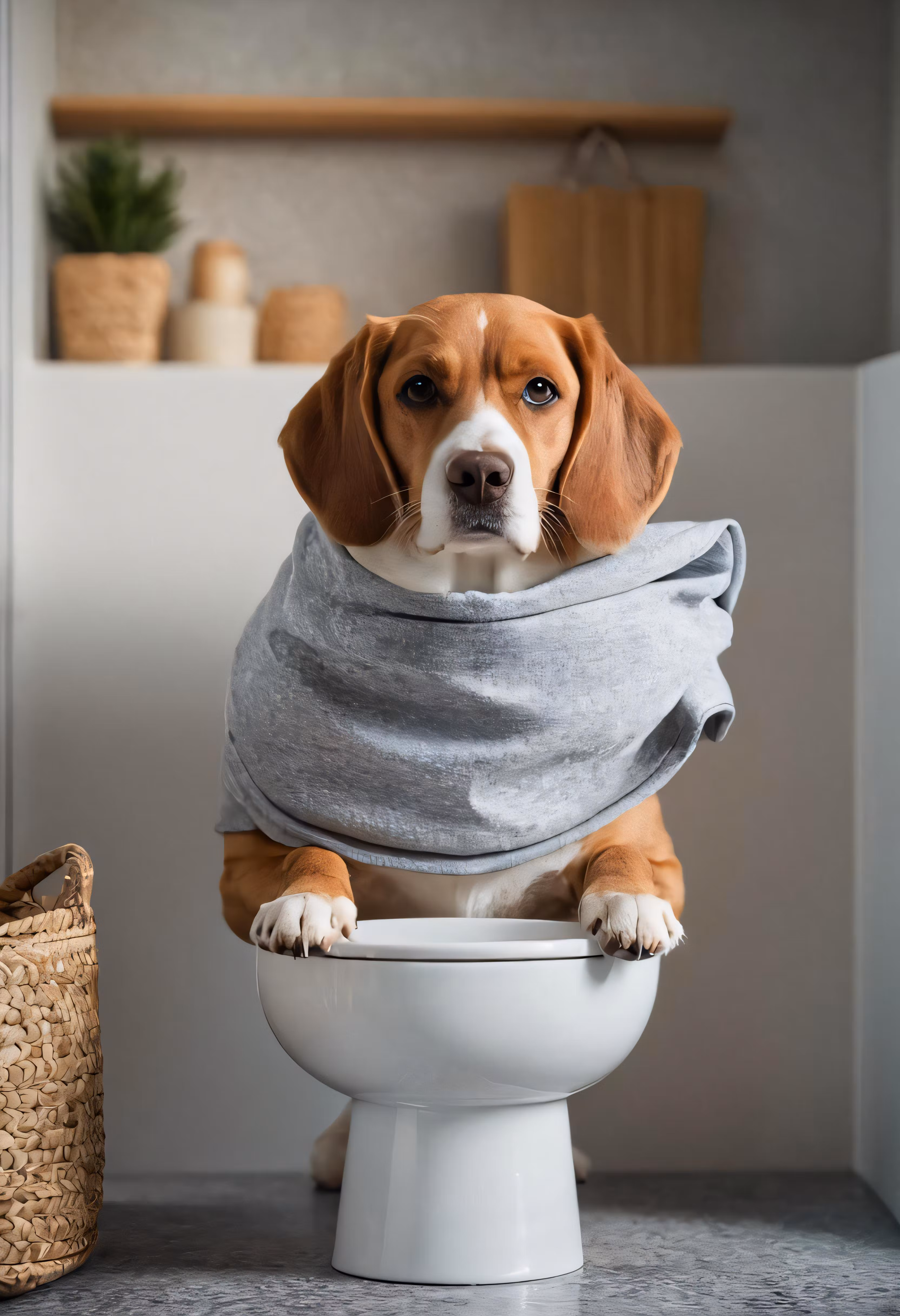High resolution picture, free to use, a brown and white dog wearing a blanket sitting on top of a toilet