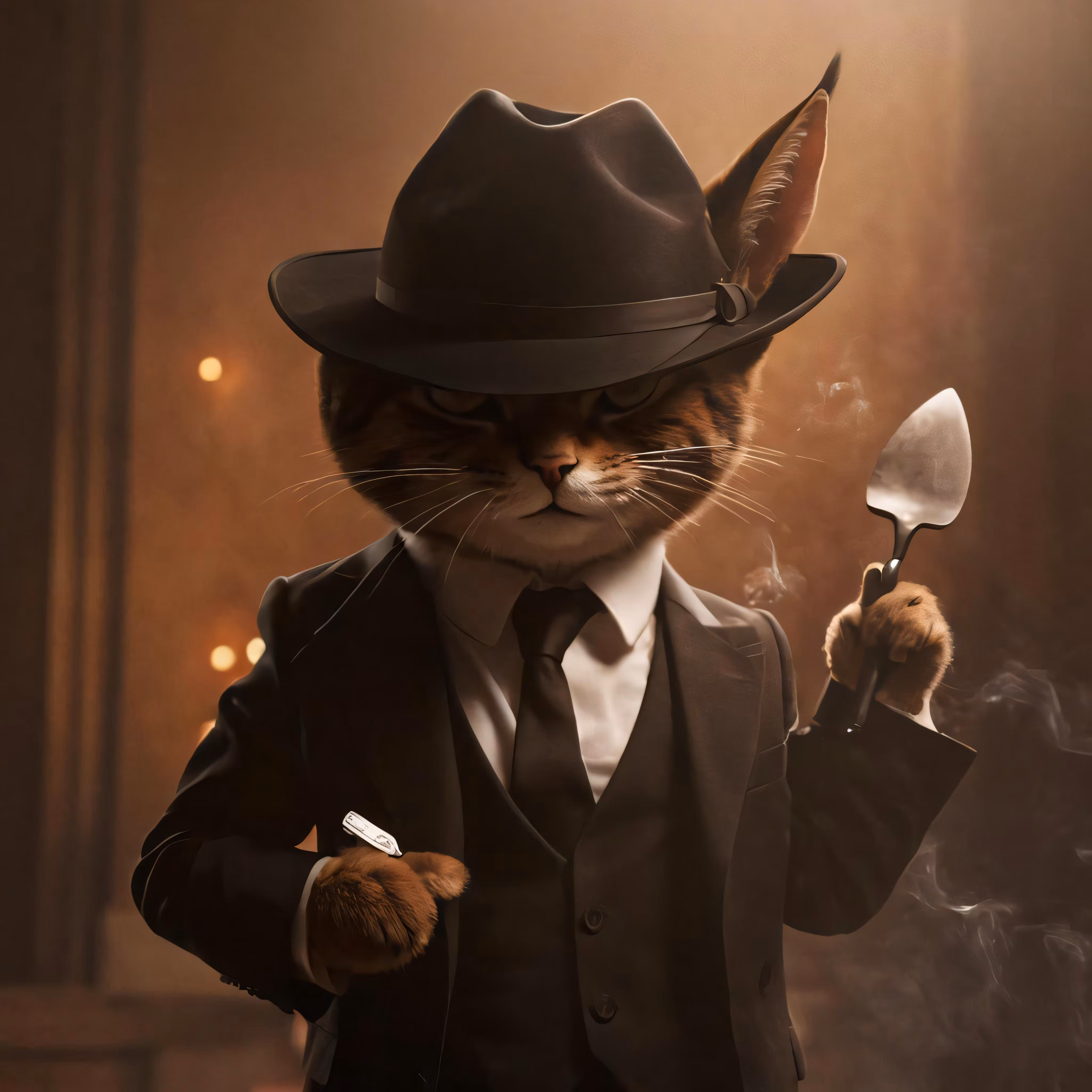 High resolution picture, free to use, a brown cat wearing a suit and a black hat