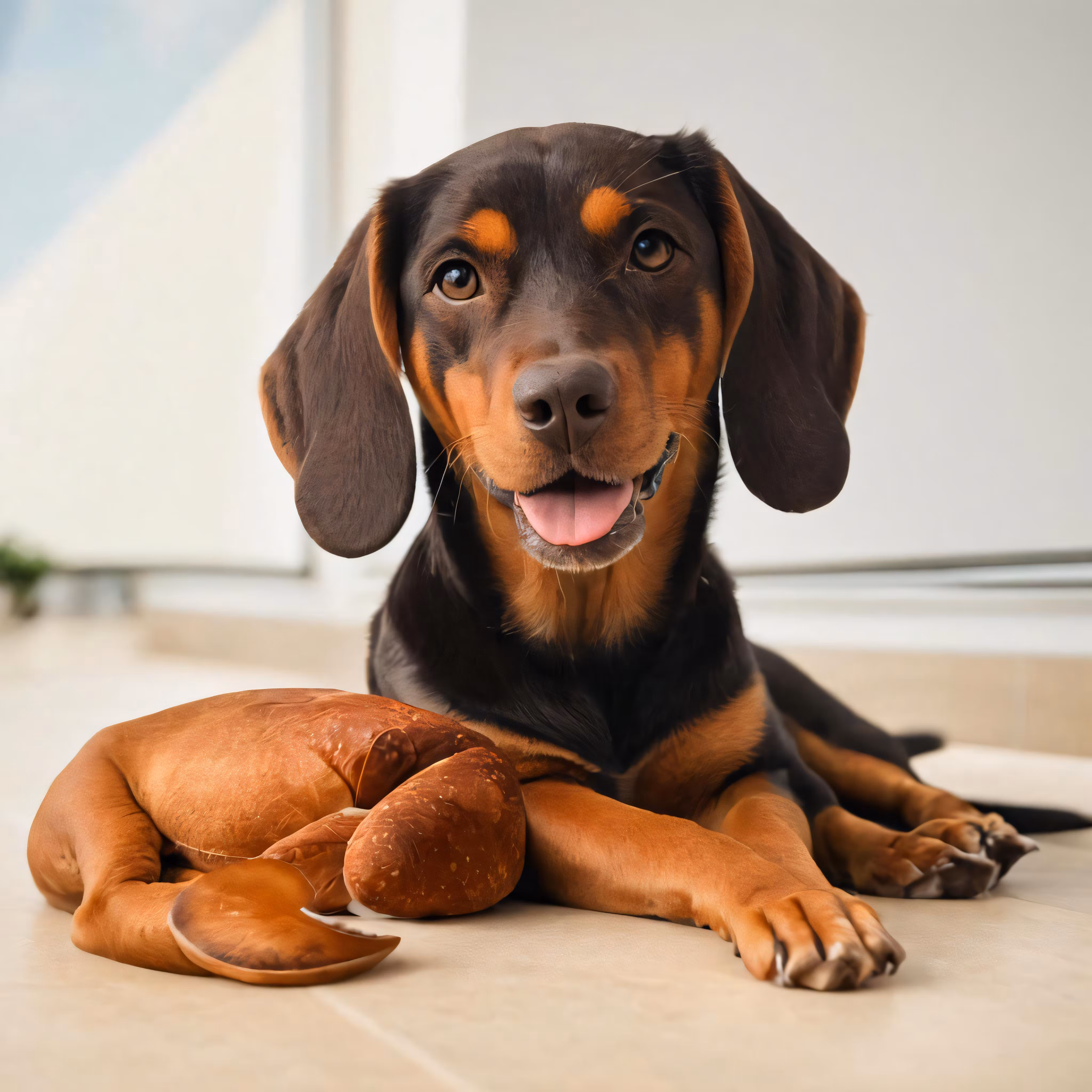 High resolution picture, free to use, a brown dog laying on the ground with a stuffed animal