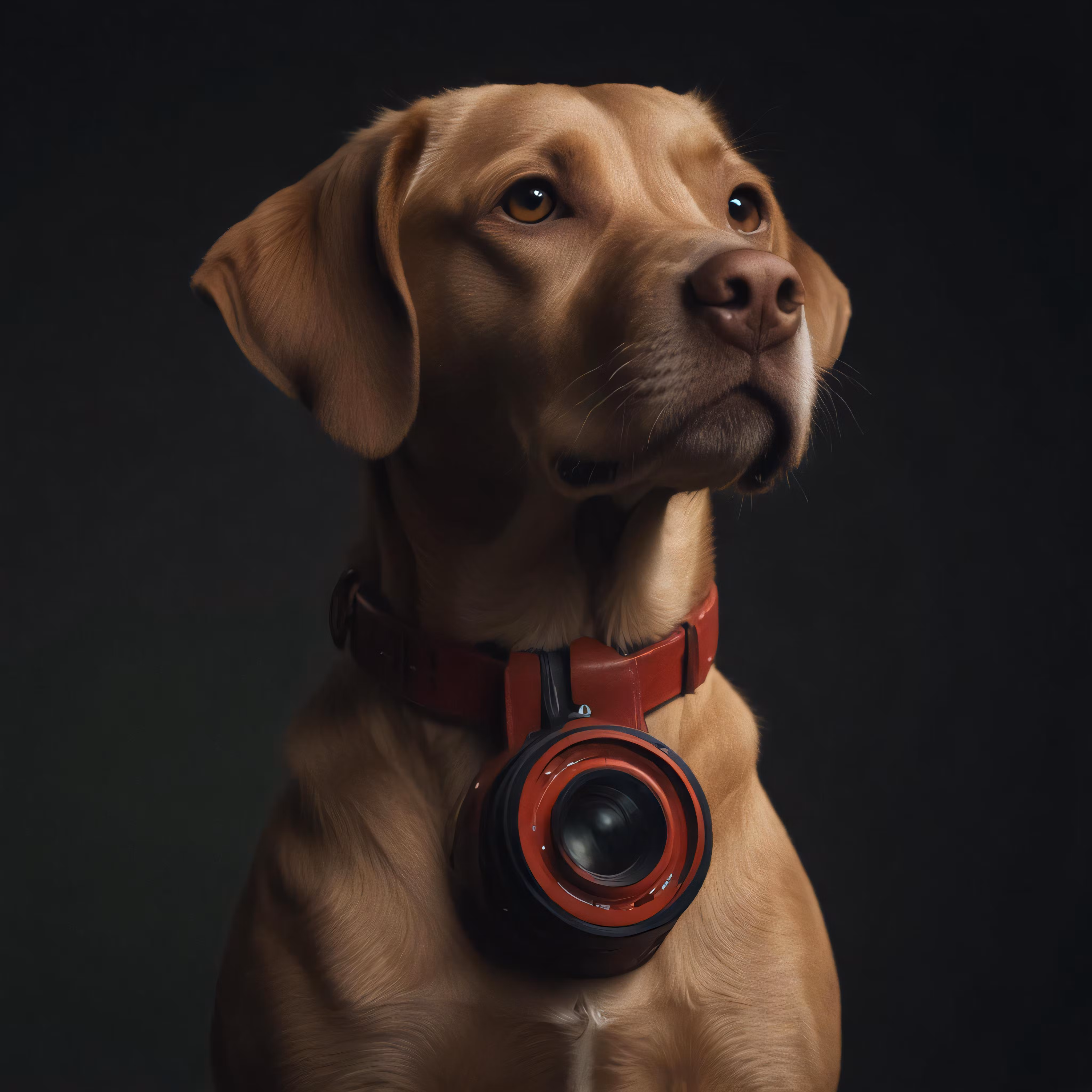 High resolution picture, free to use, a brown dog wearing a red collar with a camera in its mouth