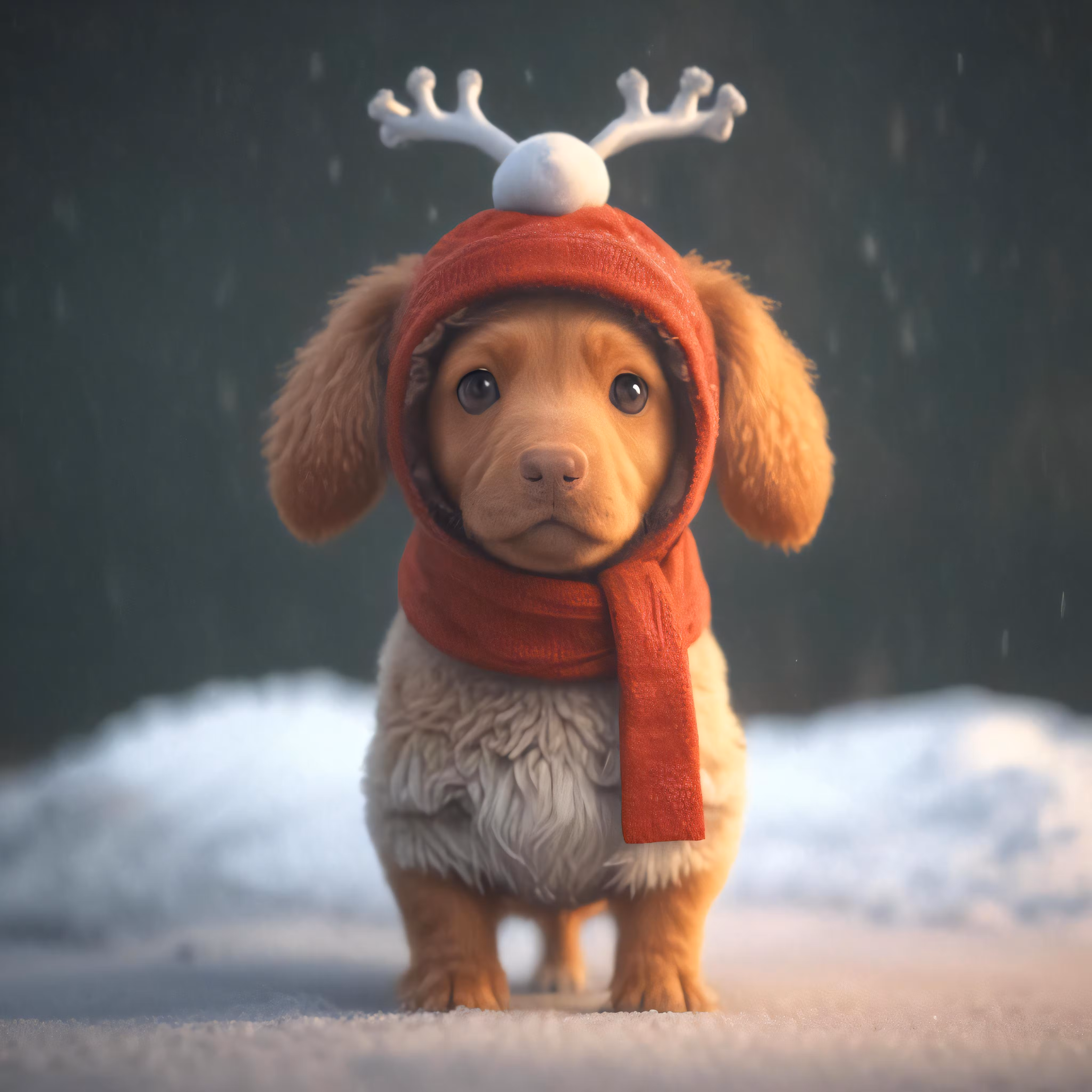 High resolution picture, free to use, a brown dog wearing a scarf and a reindeer hat