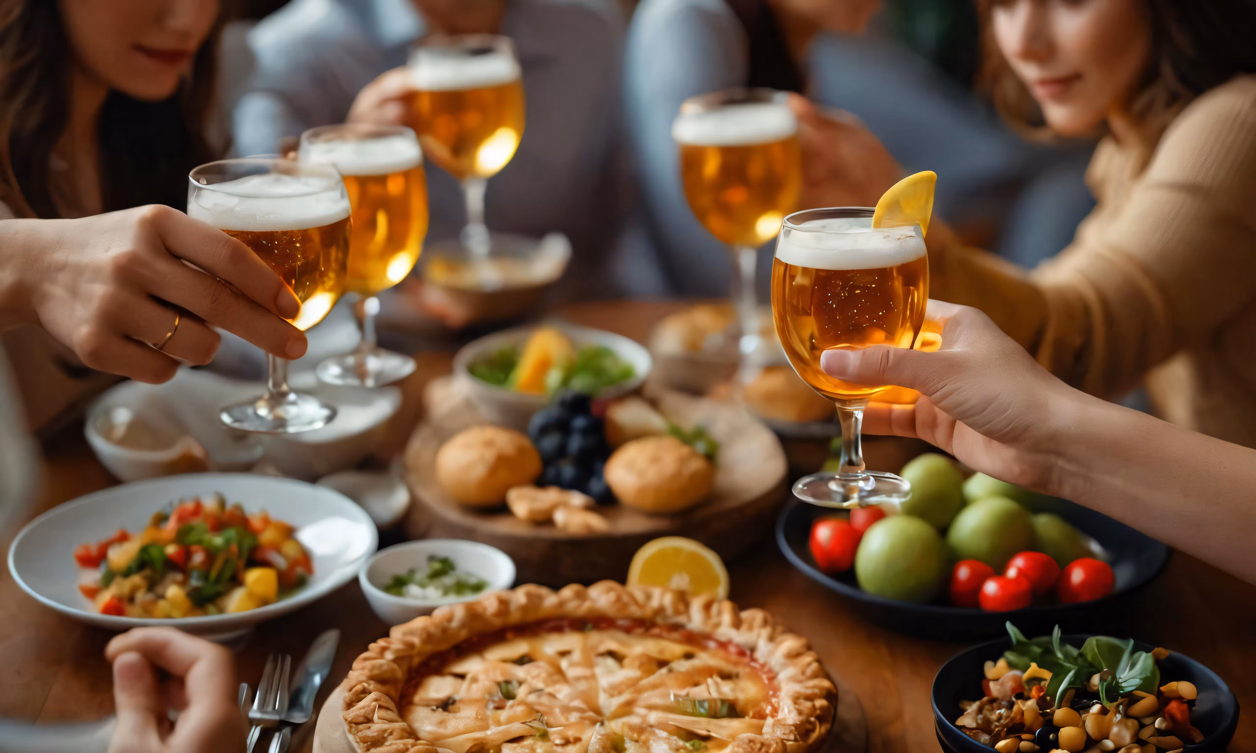 High resolution picture, free to use, a bunch of people are at a table full of wine and food