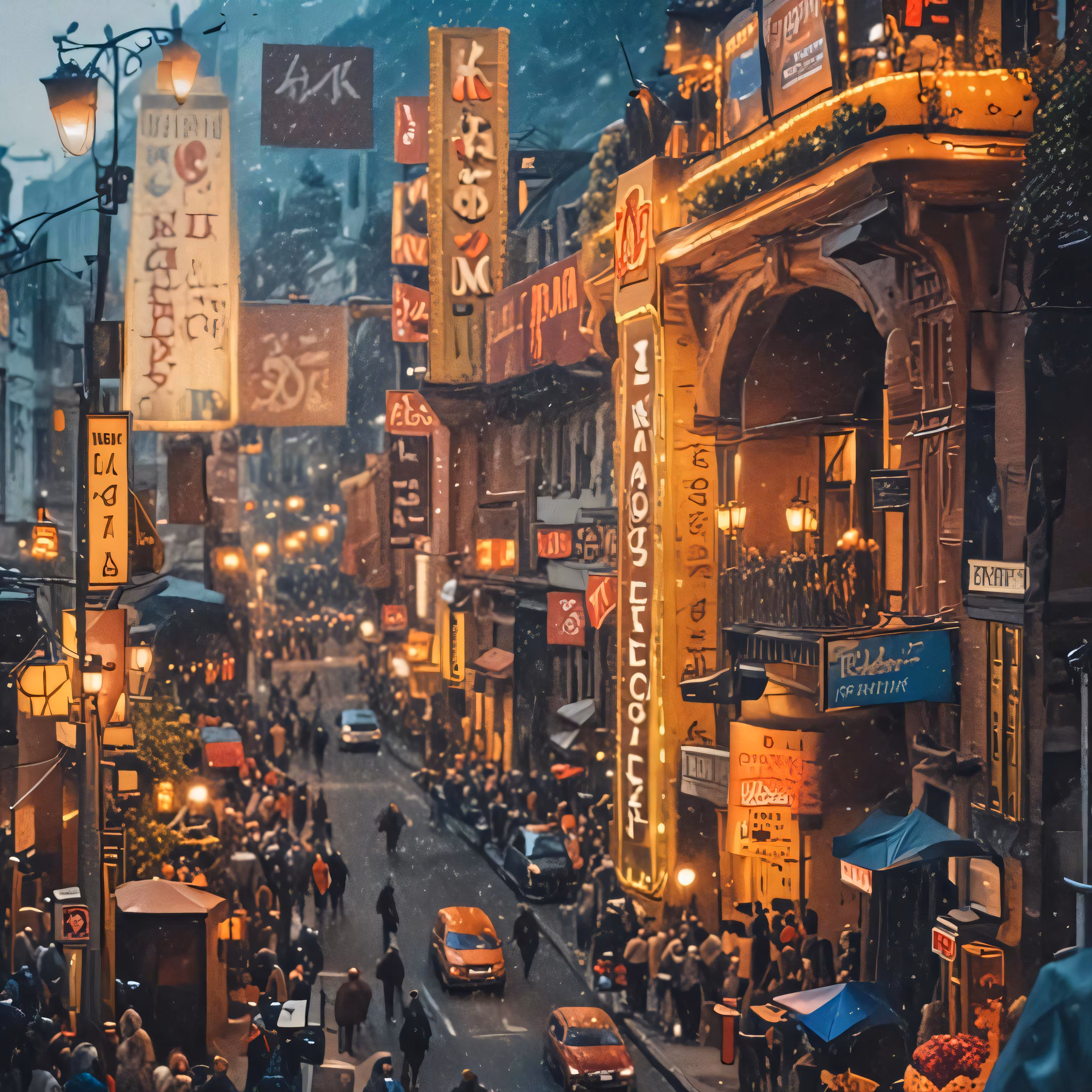 High resolution picture, free to use, a busy street at night with cars and pedestrians walking through it