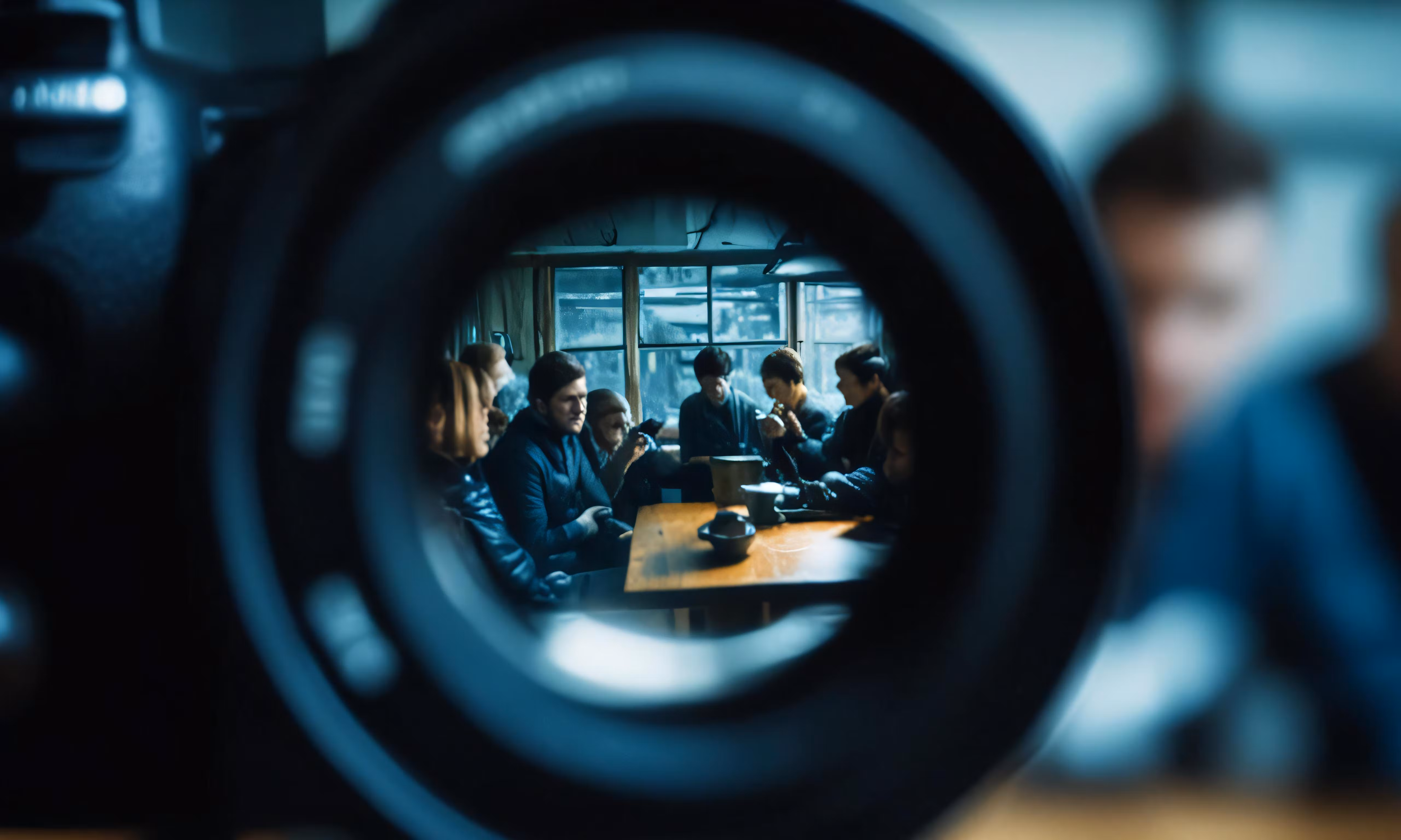 High resolution picture, free to use, a camera lens with a group of people sitting at a table