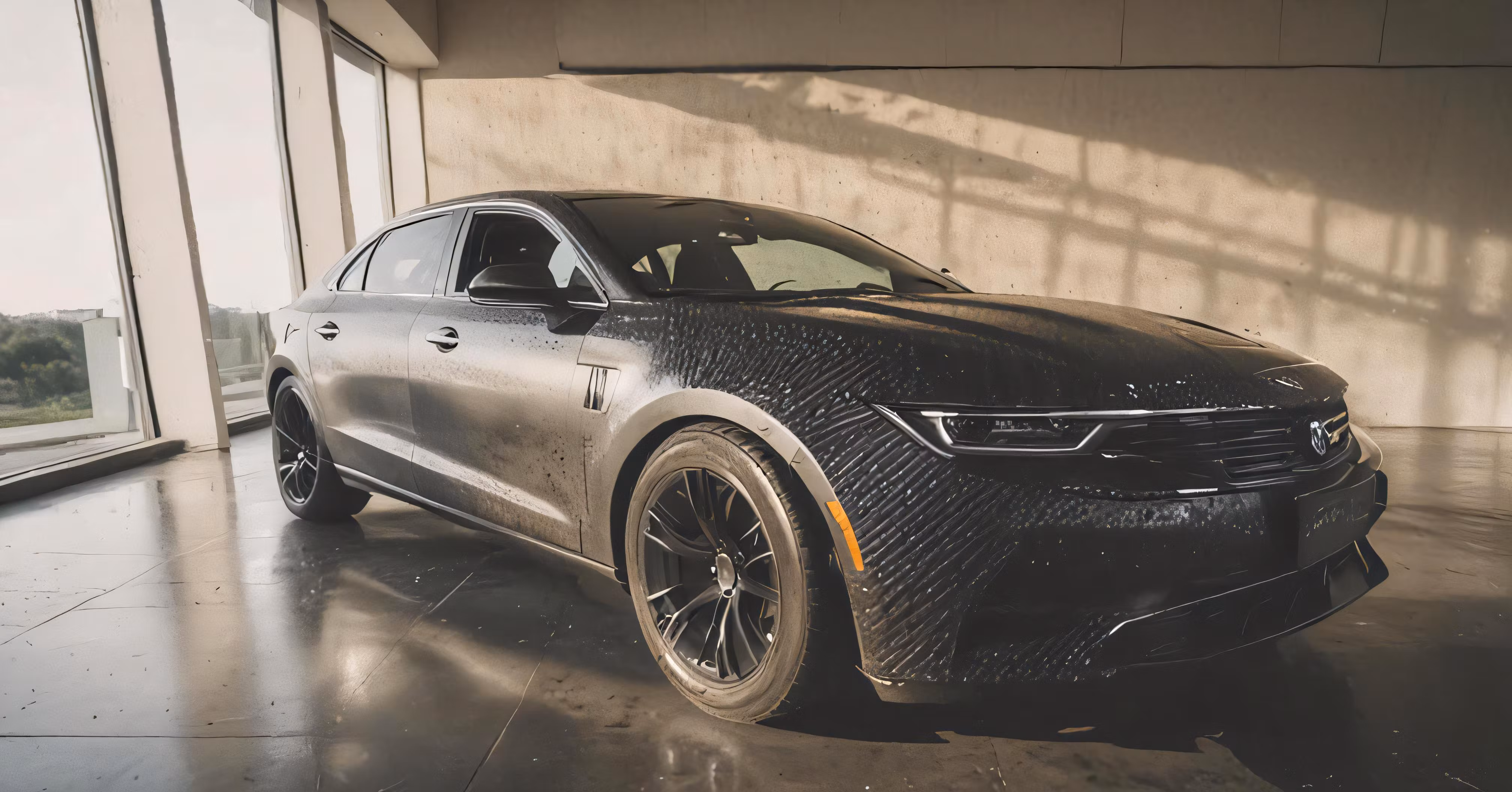 High resolution picture, free to use, a car that has been covered in mud, on a concrete floor