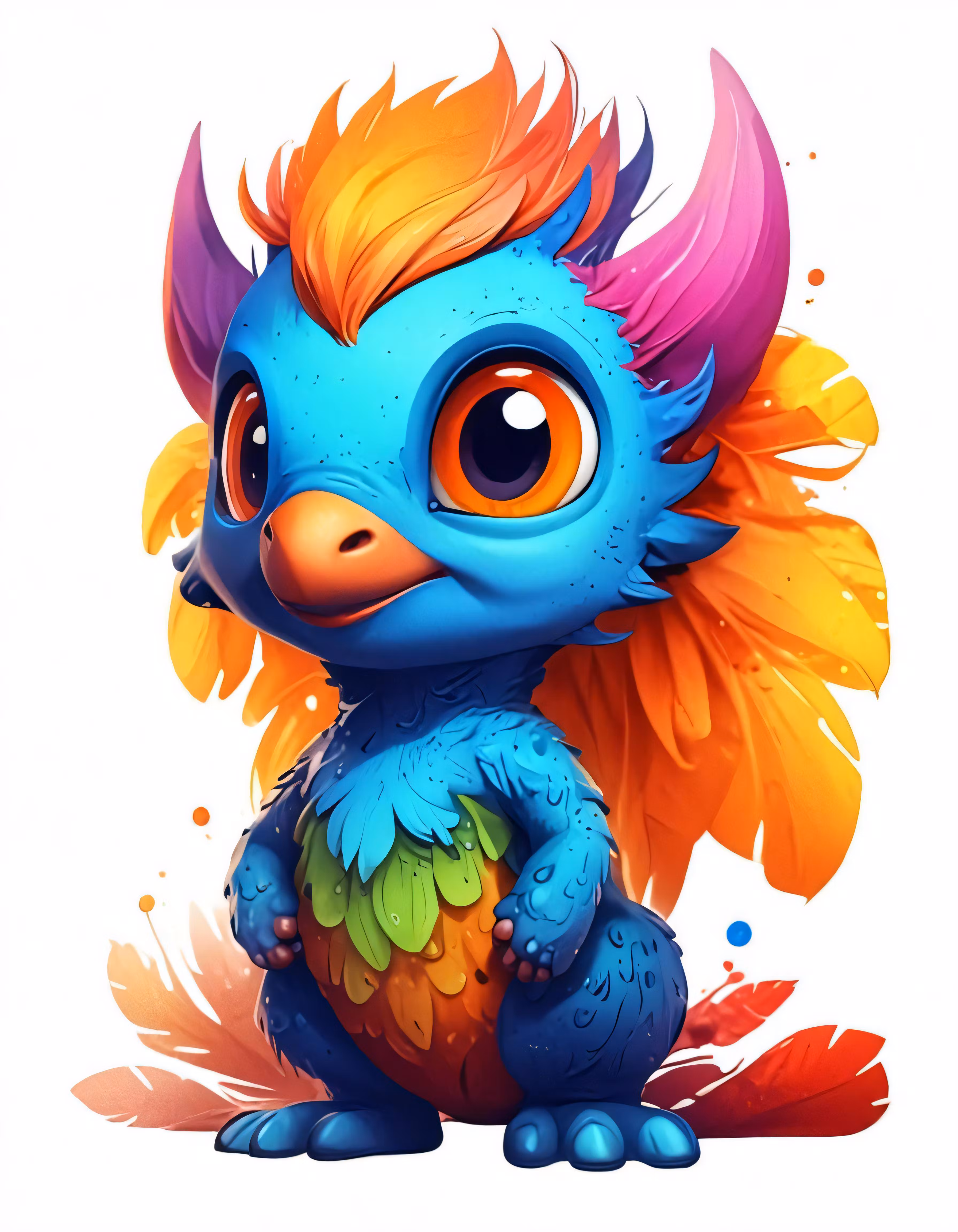 High resolution picture, free to use, a cartoon blue bird with yellow, orange and pink feathers