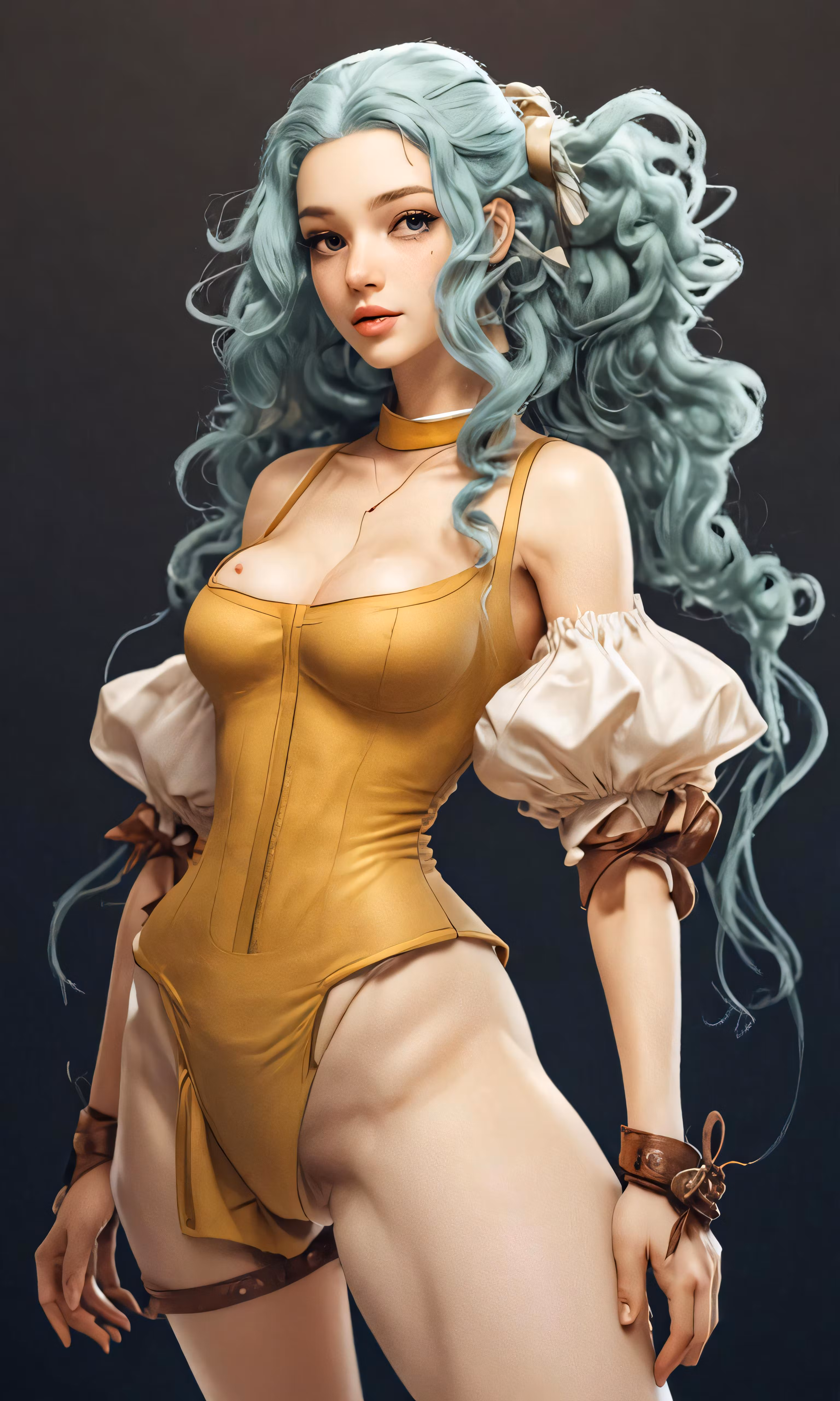High resolution picture, free to use, a cartoon girl with blue hair wearing a yellow dress and gold bodysuit