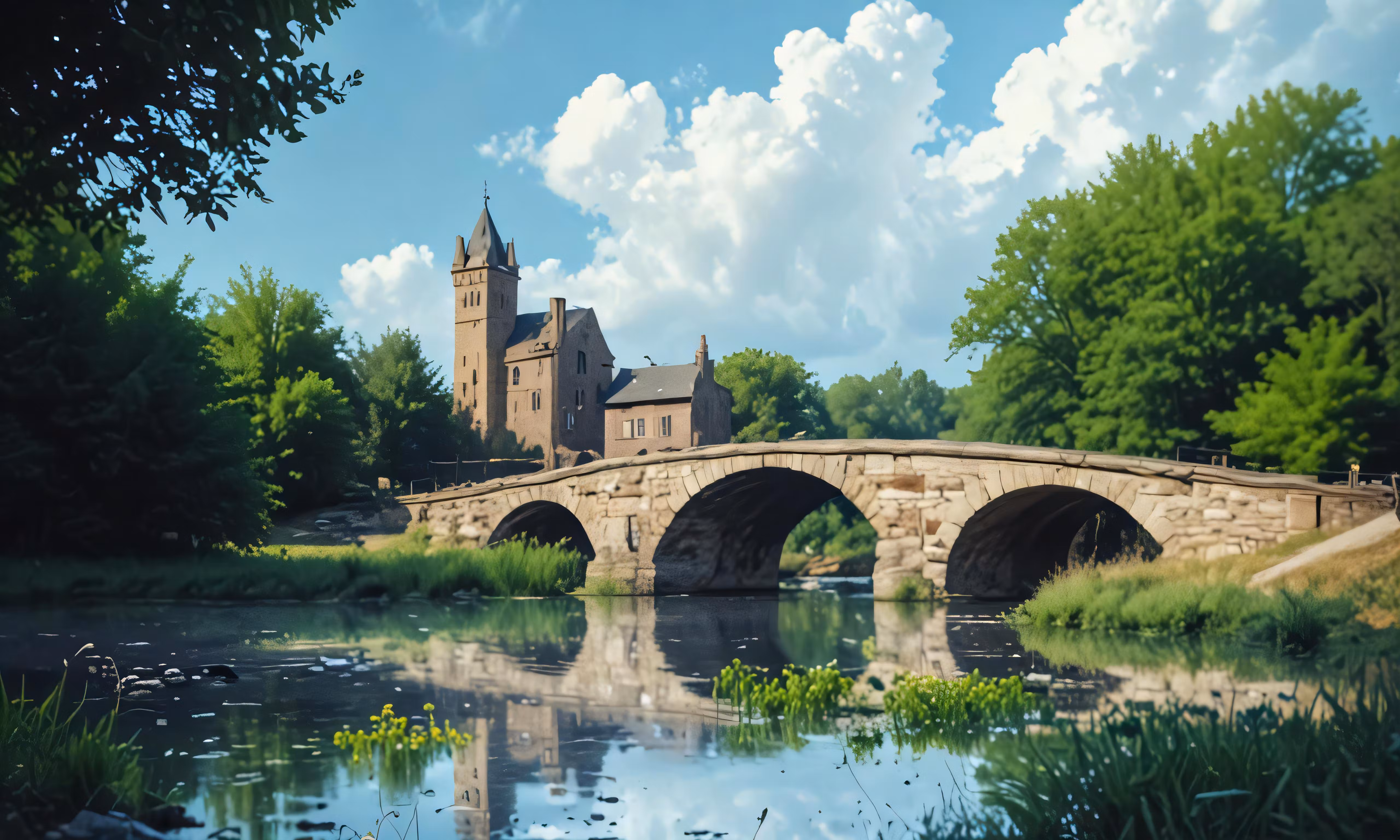 High resolution picture, free to use, a castle like building with a large bridge over it
