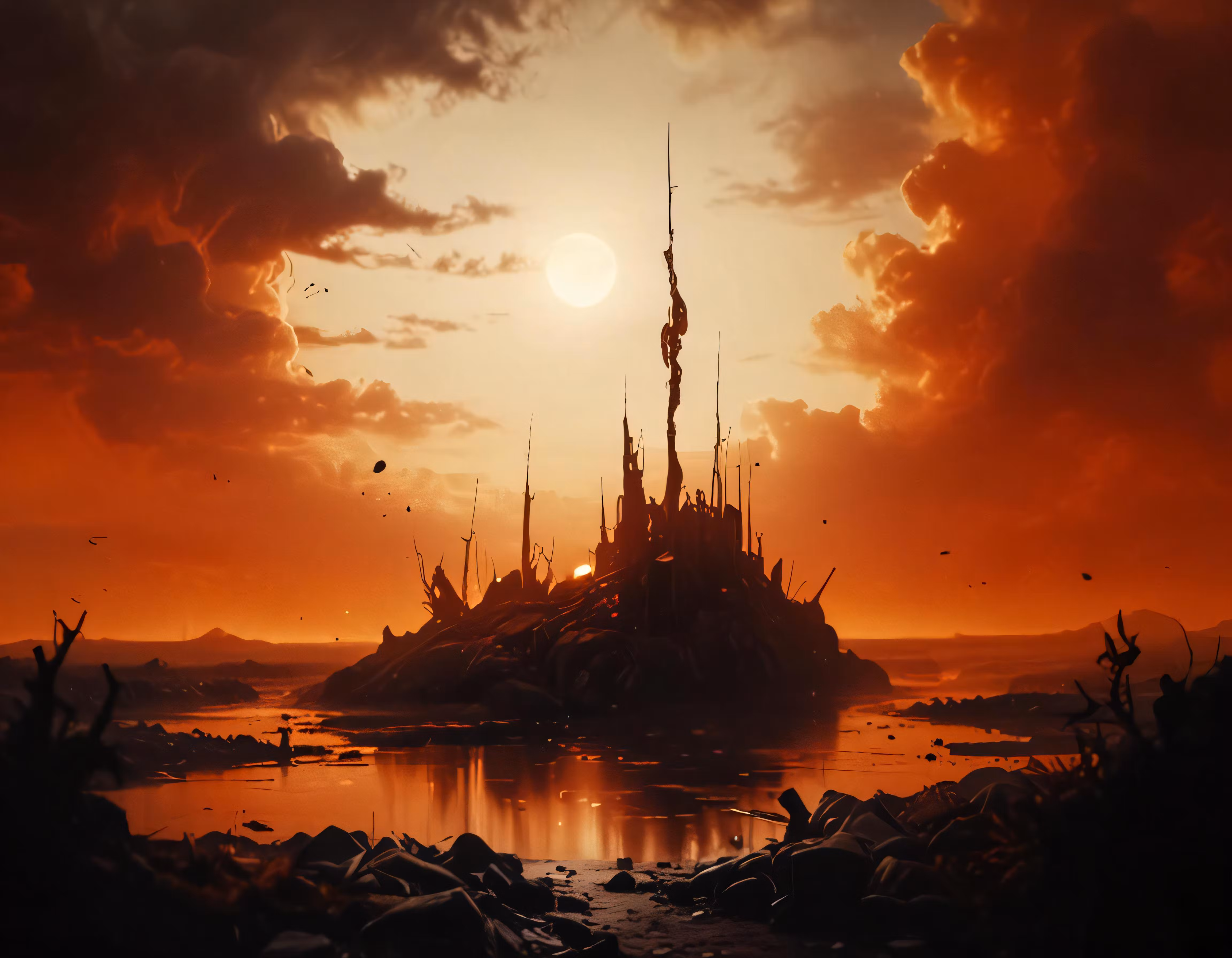 High resolution picture, free to use, a castle made out of sticks, is in the sunset