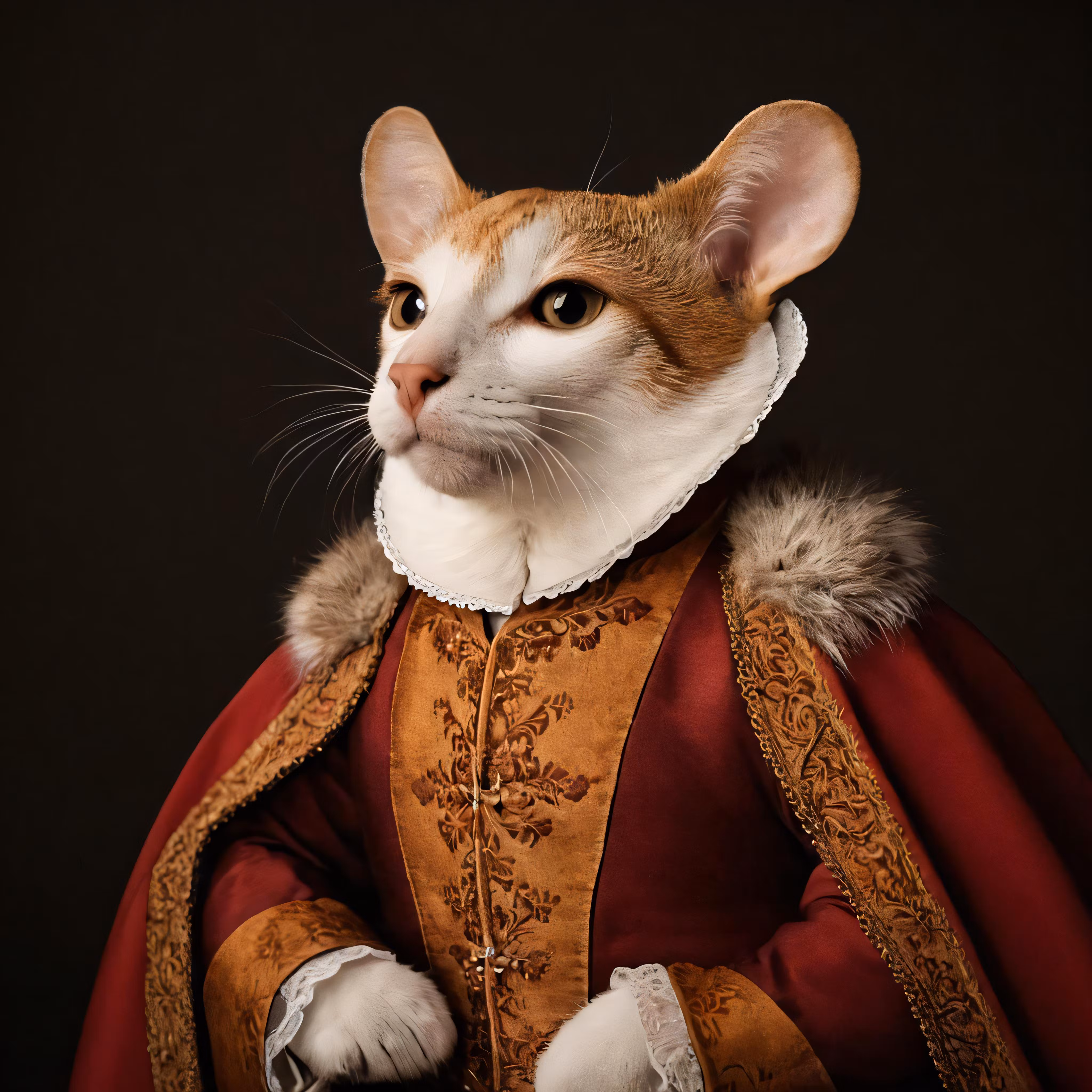 High resolution picture, free to use, a cat dressed in a red and yellow outfit