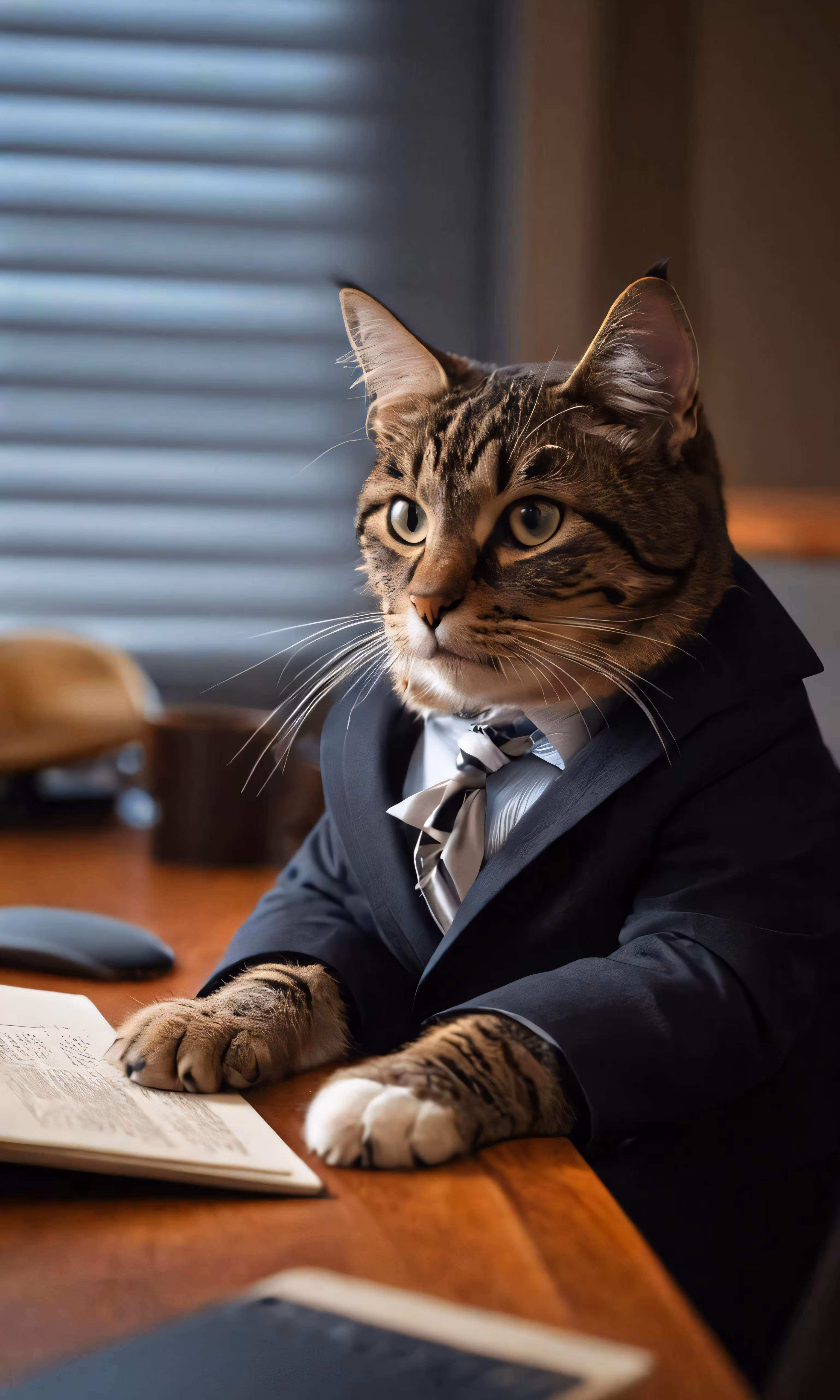 High resolution picture, free to use, a cat dressed up in a suit and tie sitting at a desk