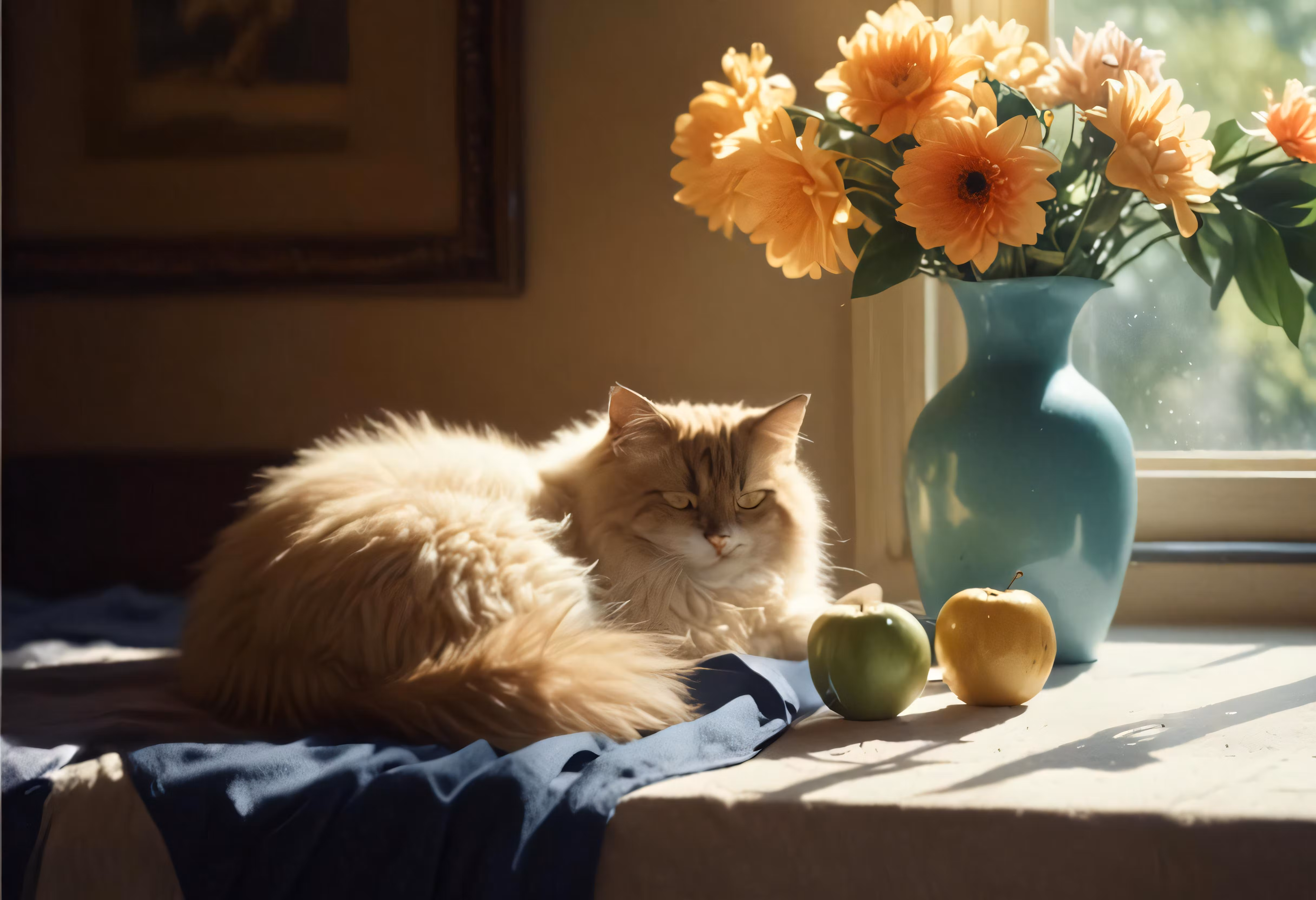 High resolution picture, free to use, a cat sitting in a window with orange flowers behind it