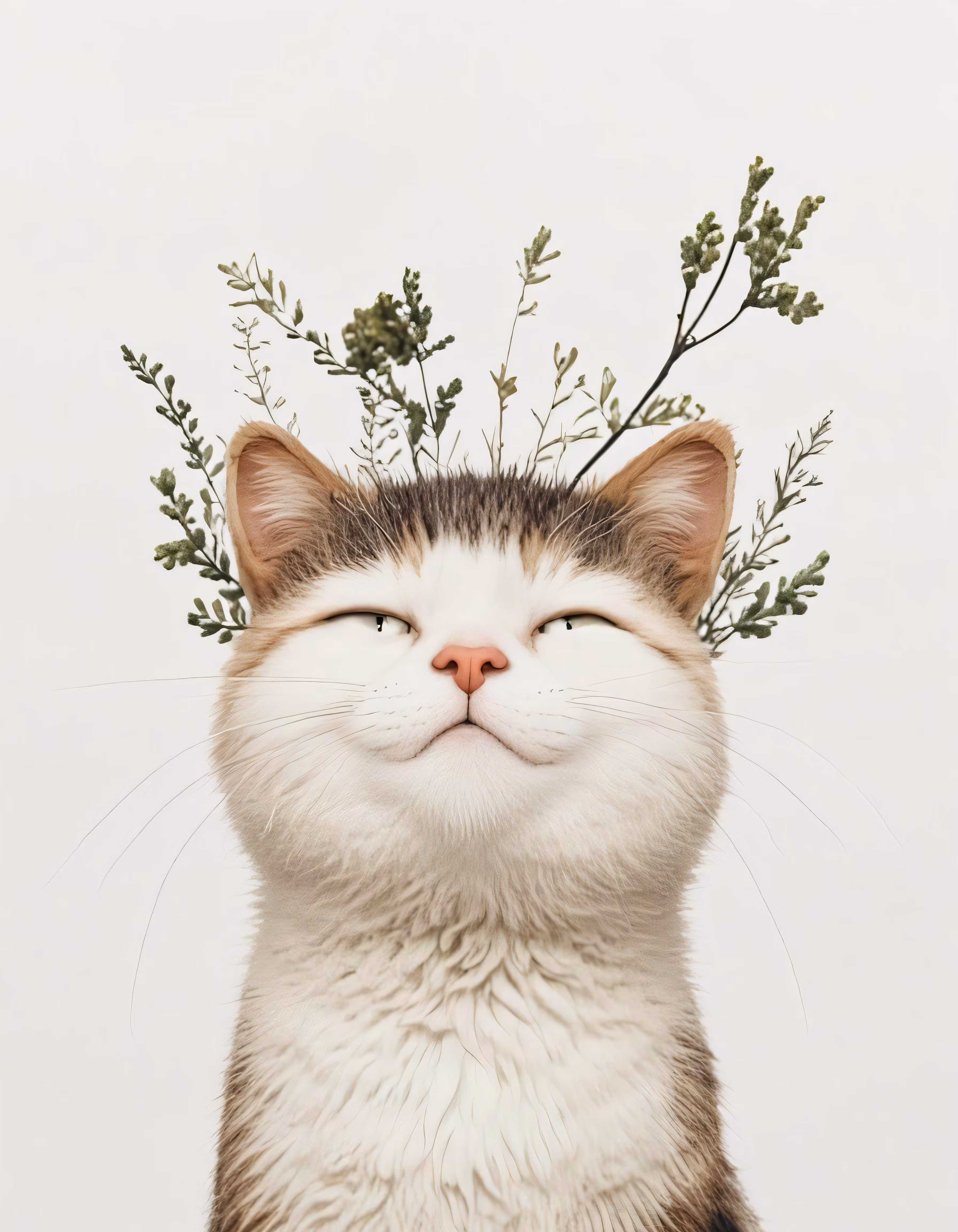 High resolution picture, free to use, a cat that is looking up with leaves growing on his head