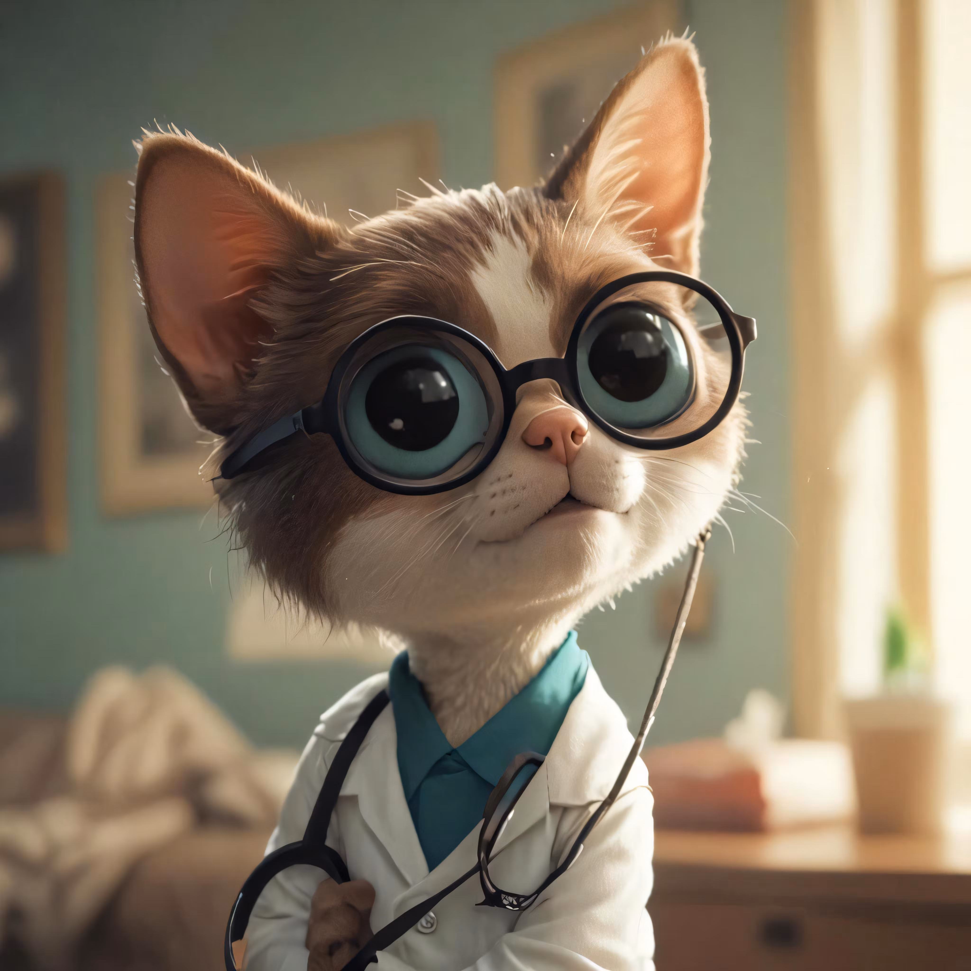 High resolution picture, free to use, a cat wearing eye glasses and a white lab coat