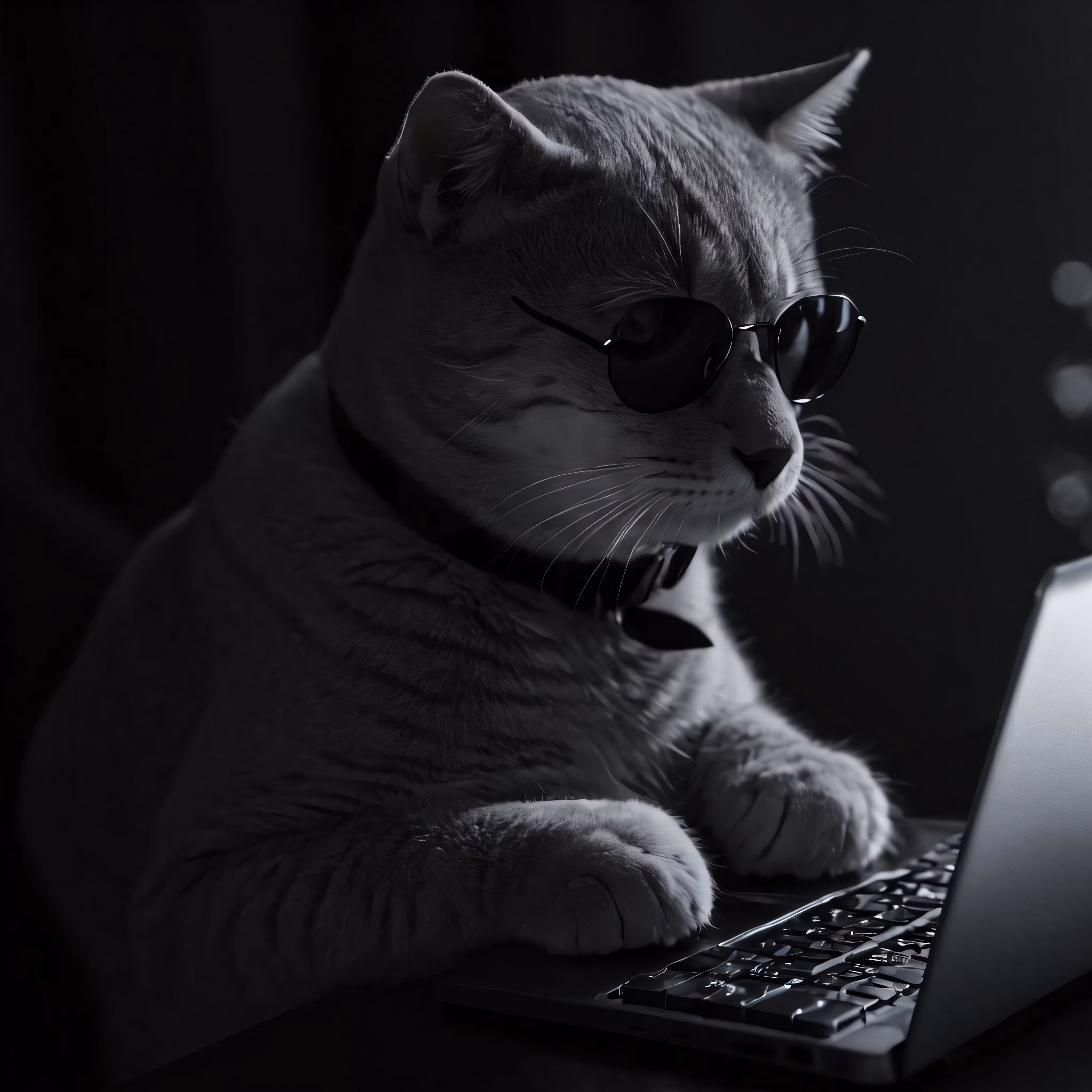 High resolution picture, free to use, a cat wearing sunglasses with its paws on a laptop