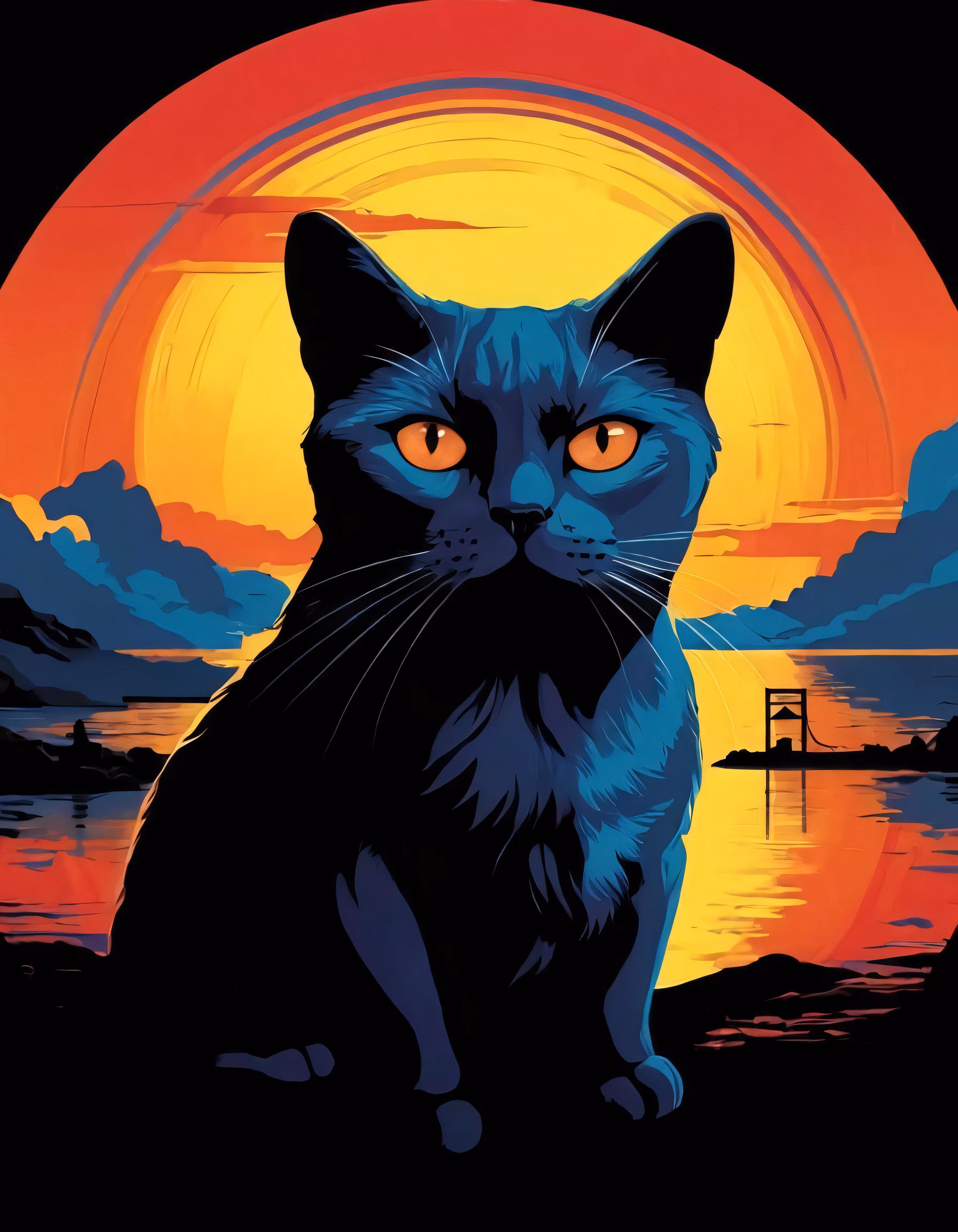High resolution picture, free to use, a cat with its eyes closed sitting by a sunset