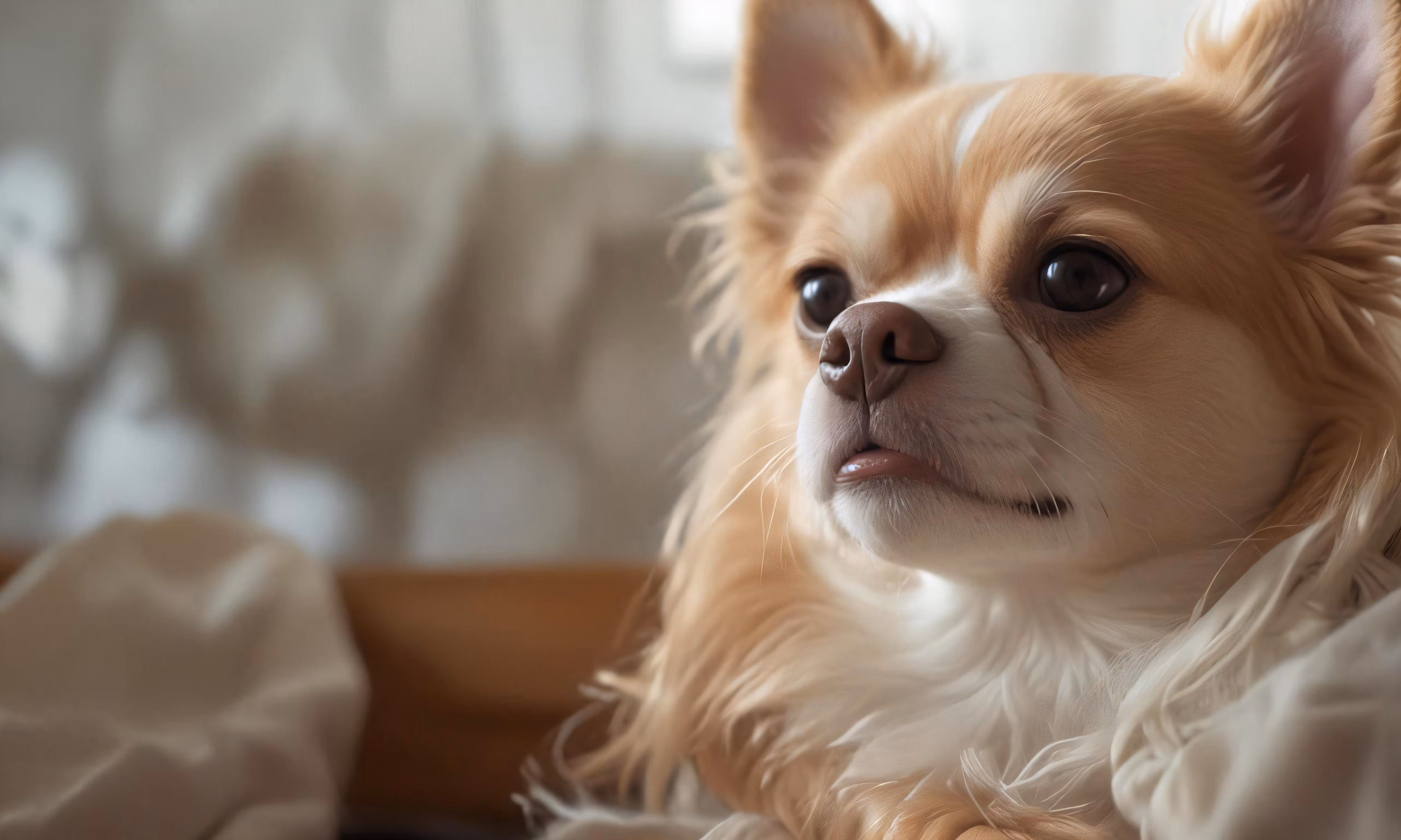 High resolution picture, free to use, a chihuahua is staring intently while on the sofa