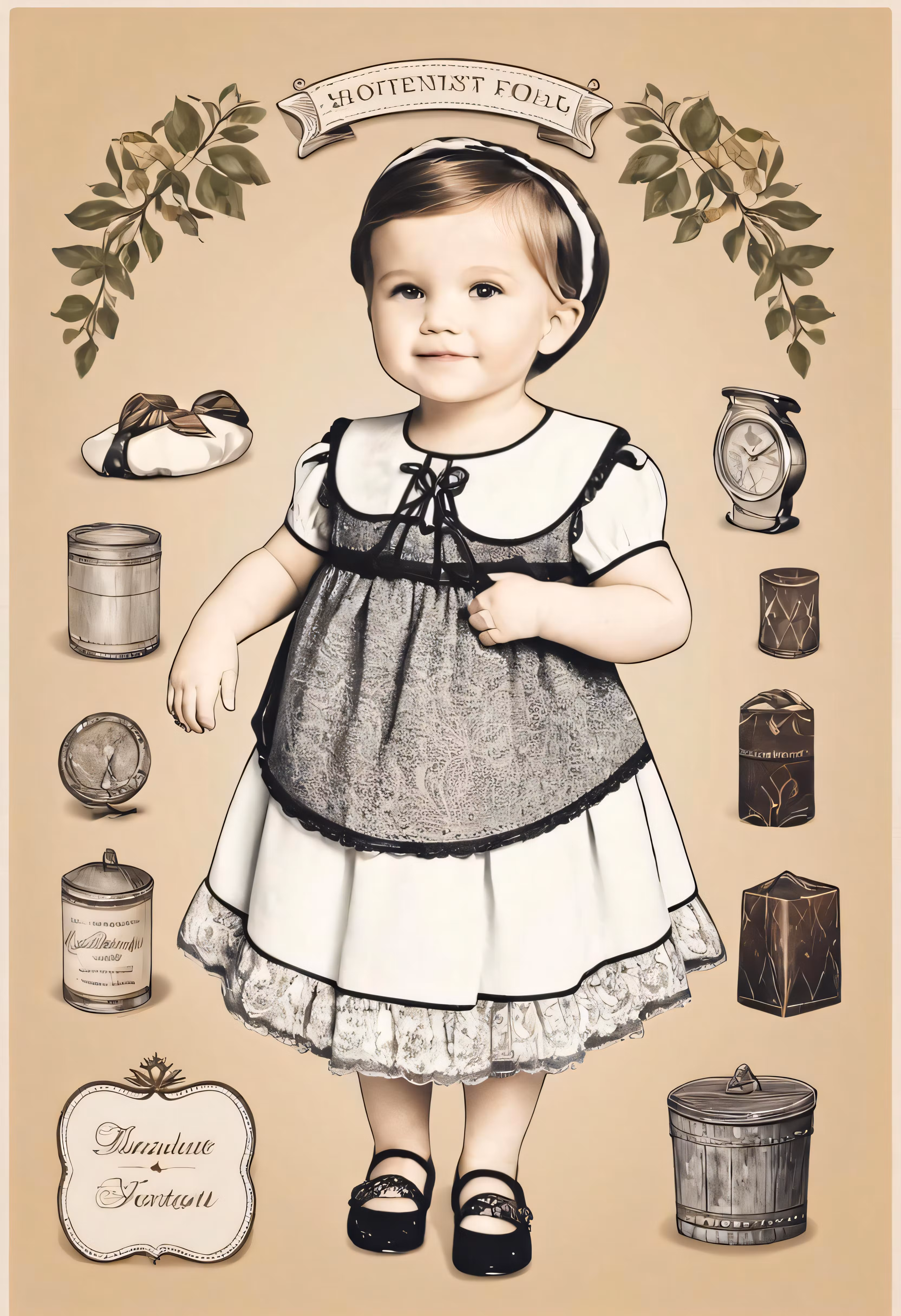 High resolution picture, free to use, a child wearing black shoes stands in front of a brown background with many objects