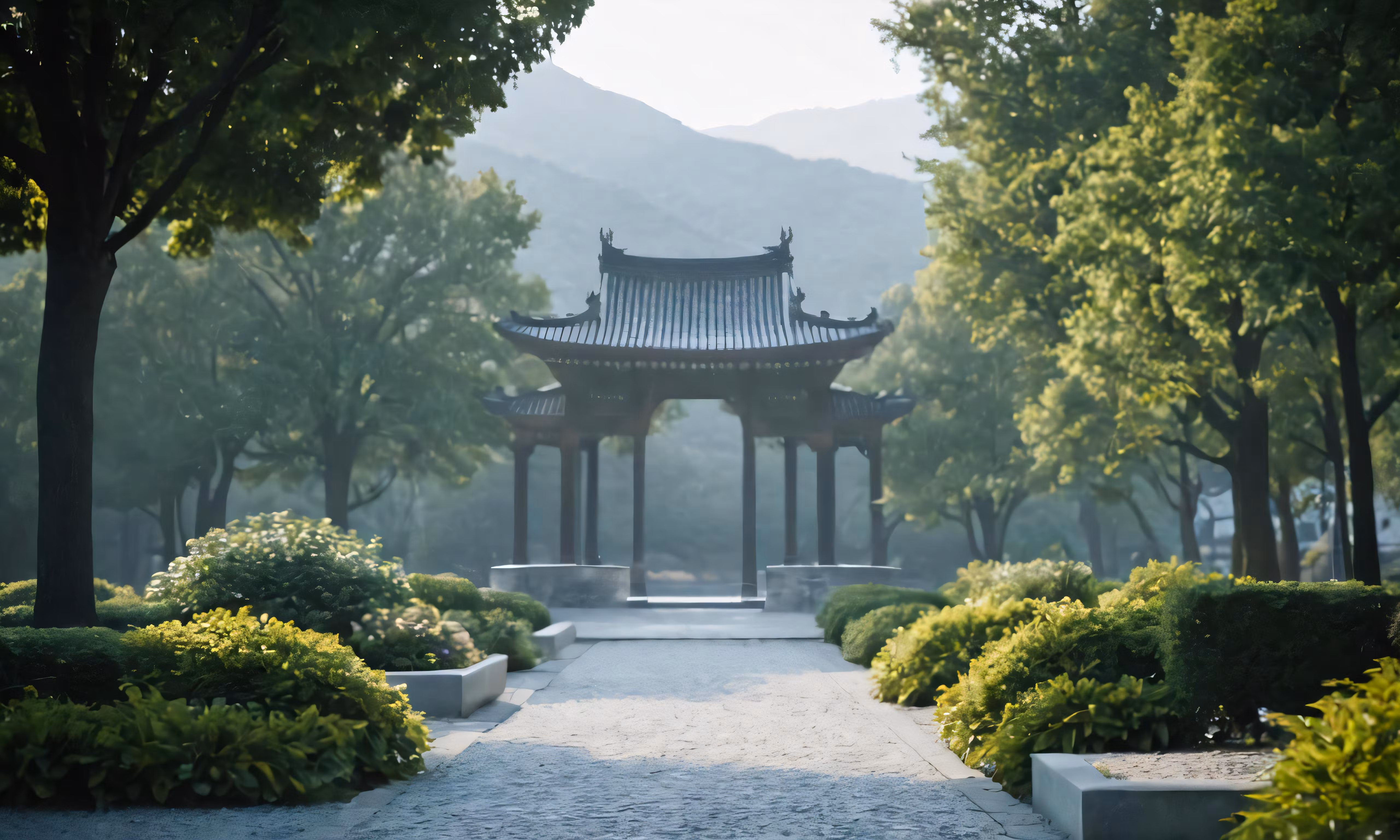 High resolution picture, free to use, a chinese structure with trees and plants at the end