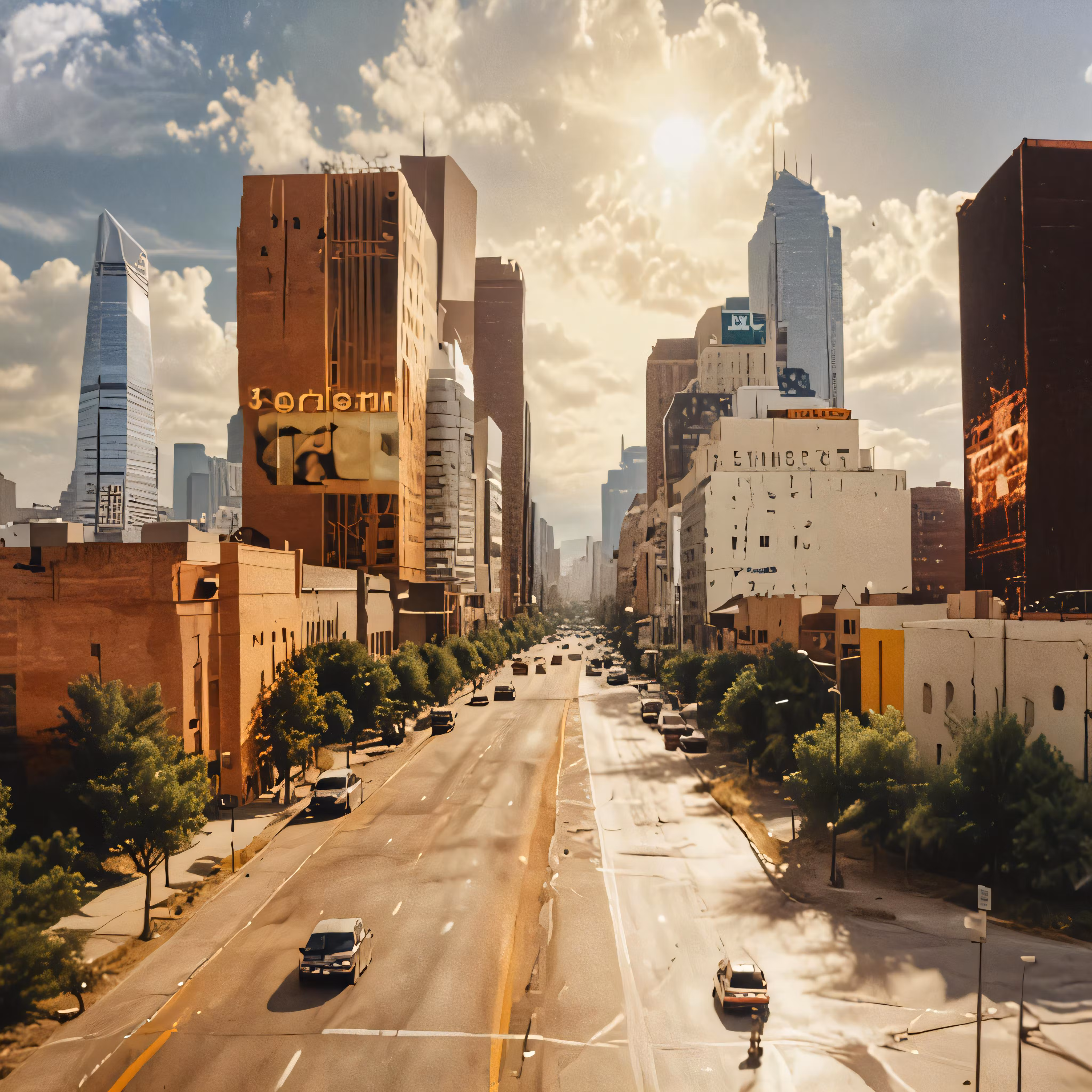 High resolution picture, free to use, a city street filled with tall buildings under cloudy skies
