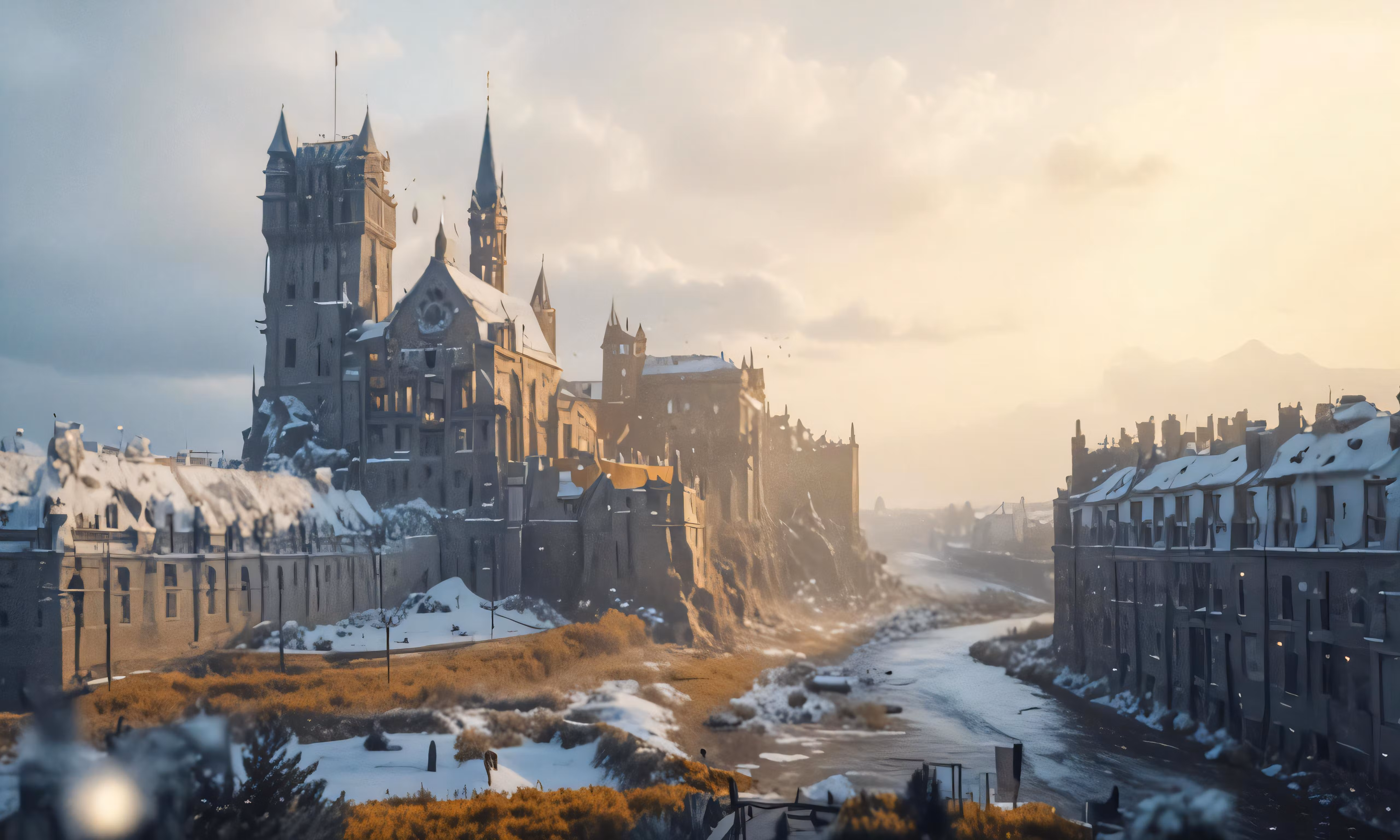 High resolution picture, free to use, a city with towers is surrounded by snow