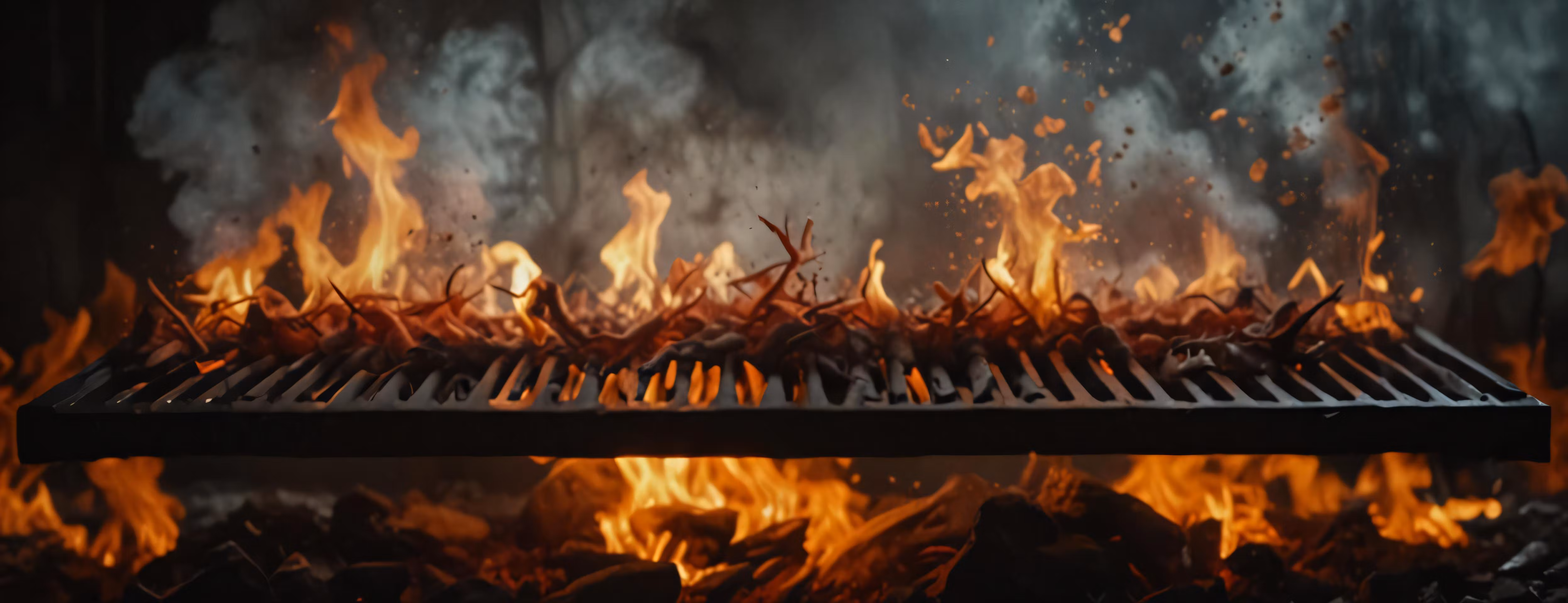 High resolution picture, free to use, a close   up of a fire grill with large, flames burning in the background