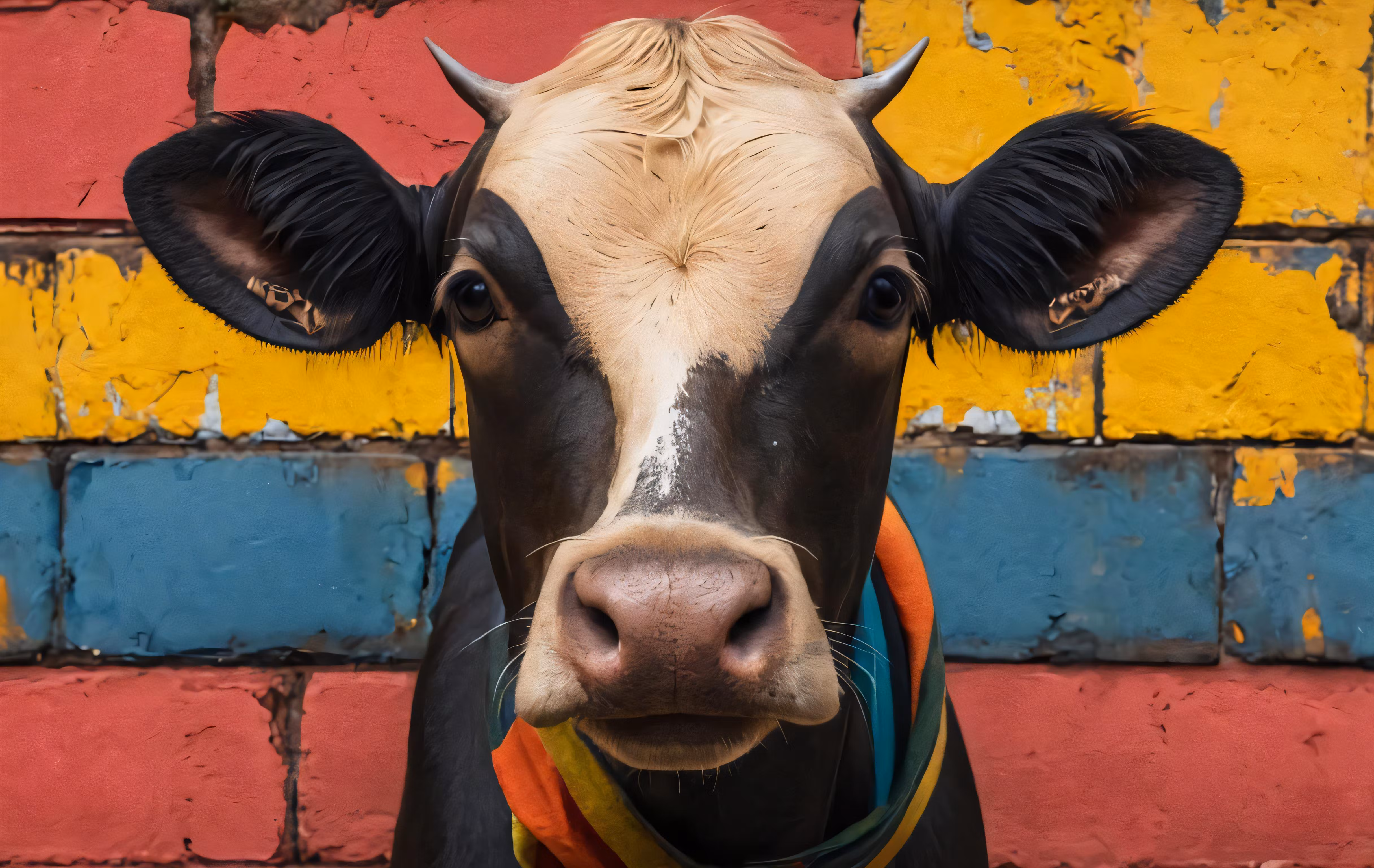 High resolution picture, free to use, a close   up of the face and head of a bull, in front of a painted wall