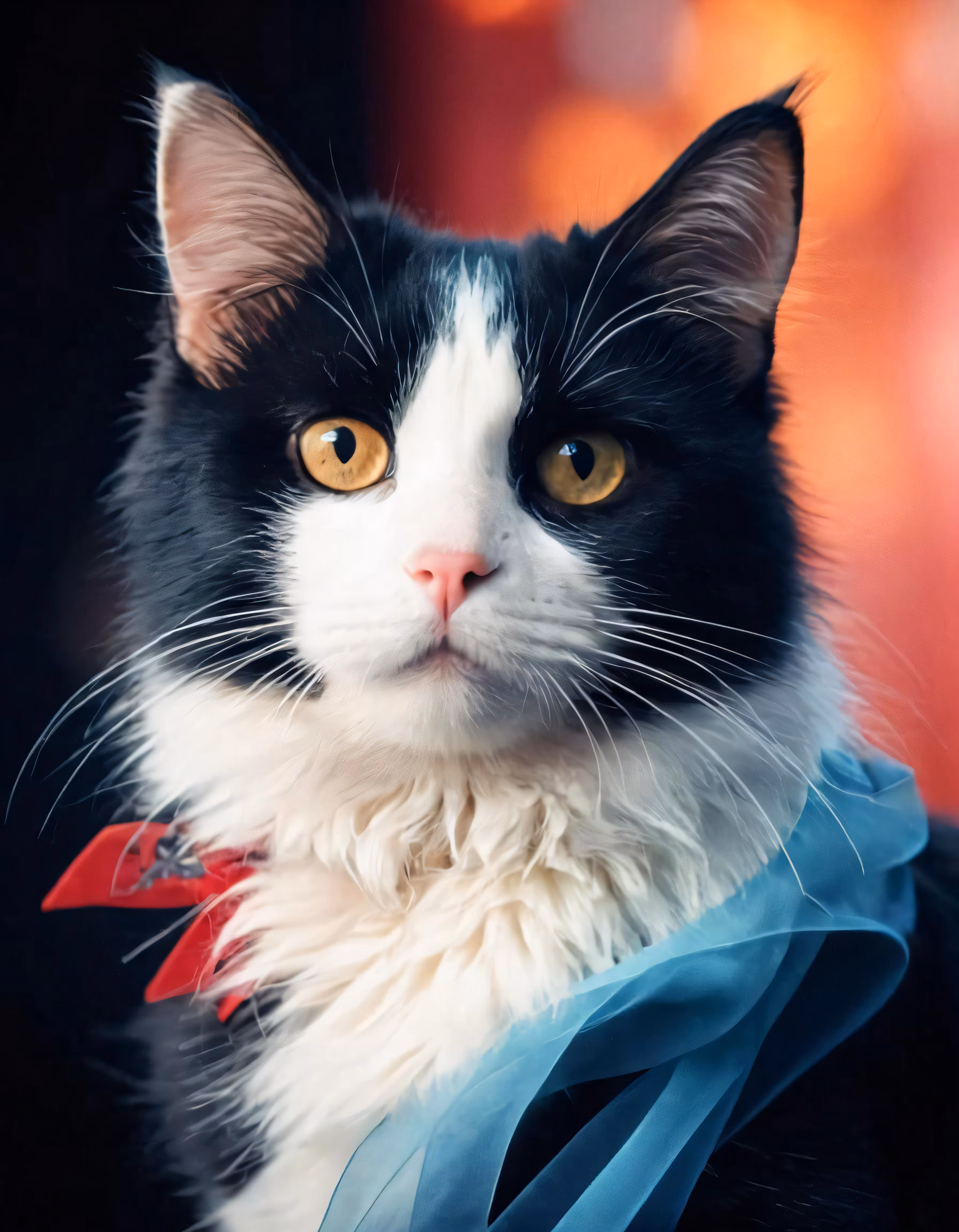 High resolution picture, free to use, a close up of a cat wearing a blue ribbon