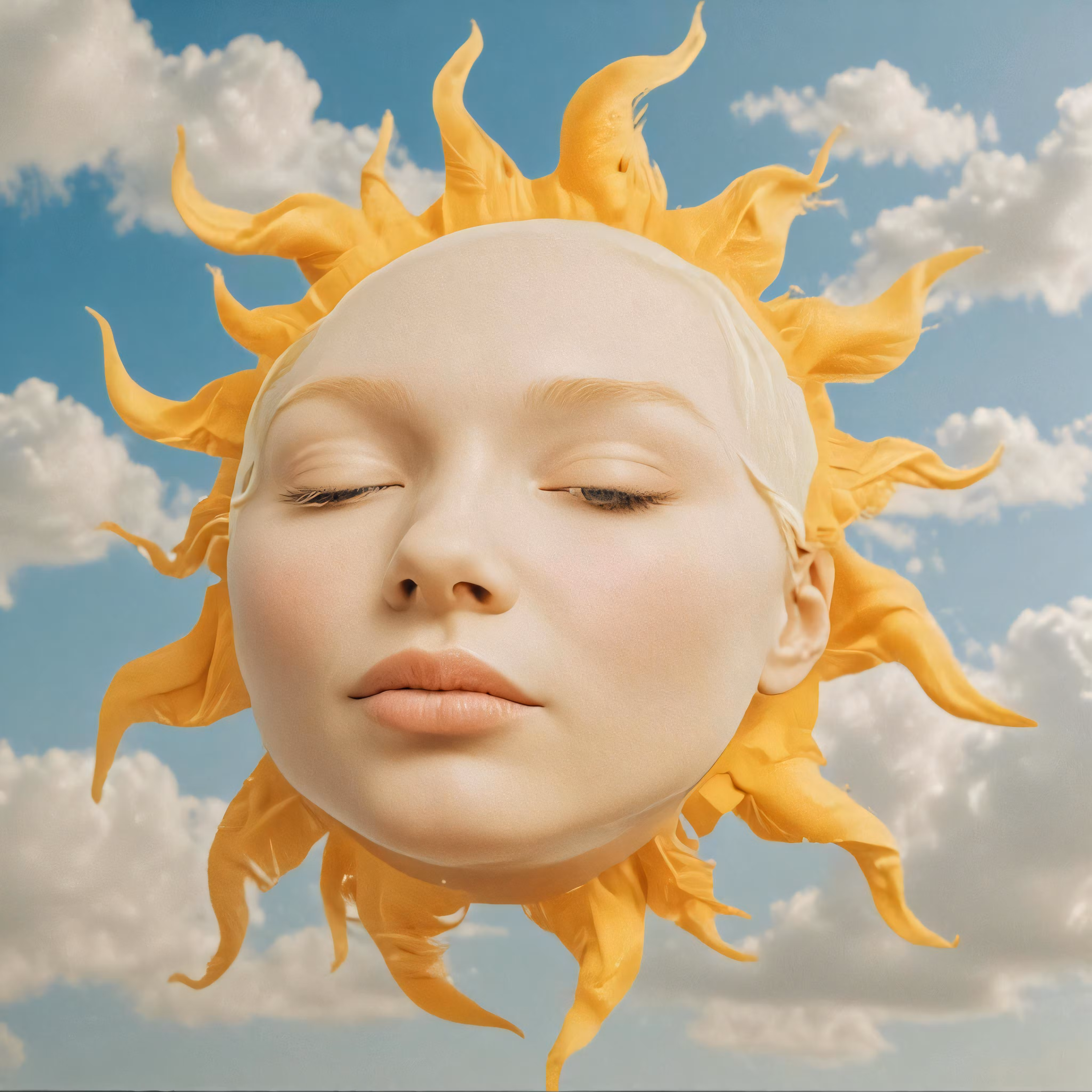 High resolution picture, free to use, a close up of a face with yellow sunflowers on the head