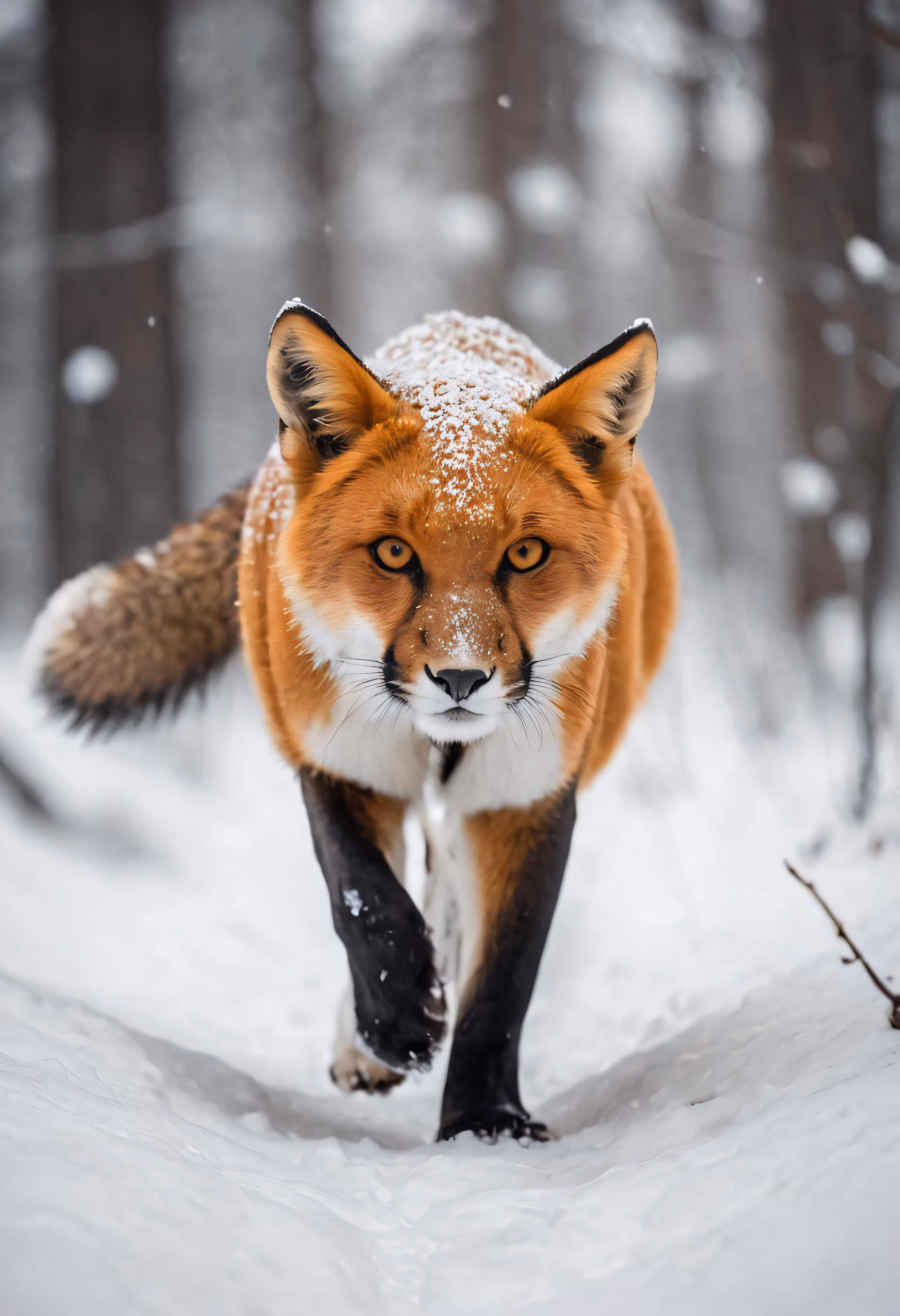High resolution picture, free to use, a close up of a fox walking through a snowy forest