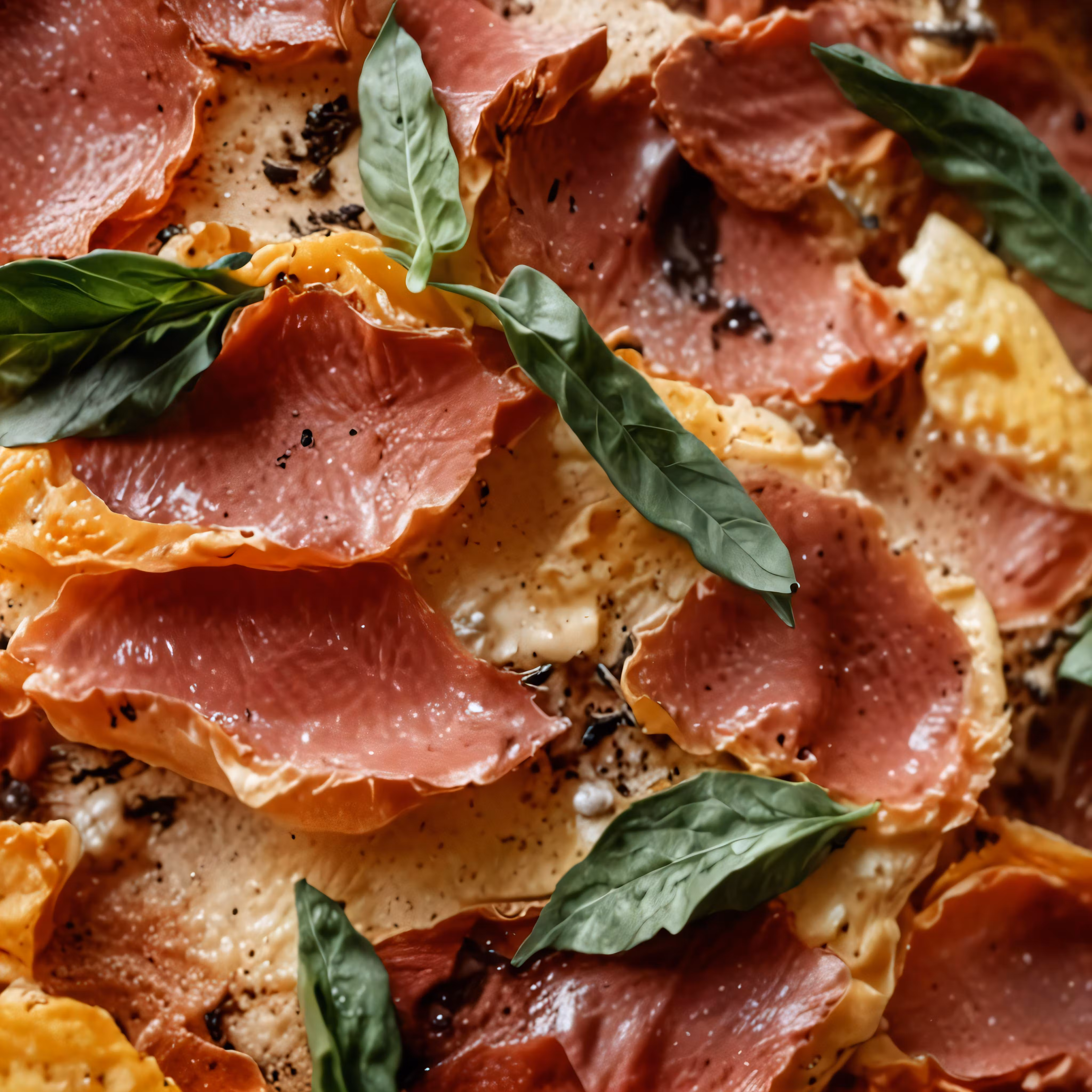 High resolution picture, free to use, a closeup view of salami and green leaves on pizza