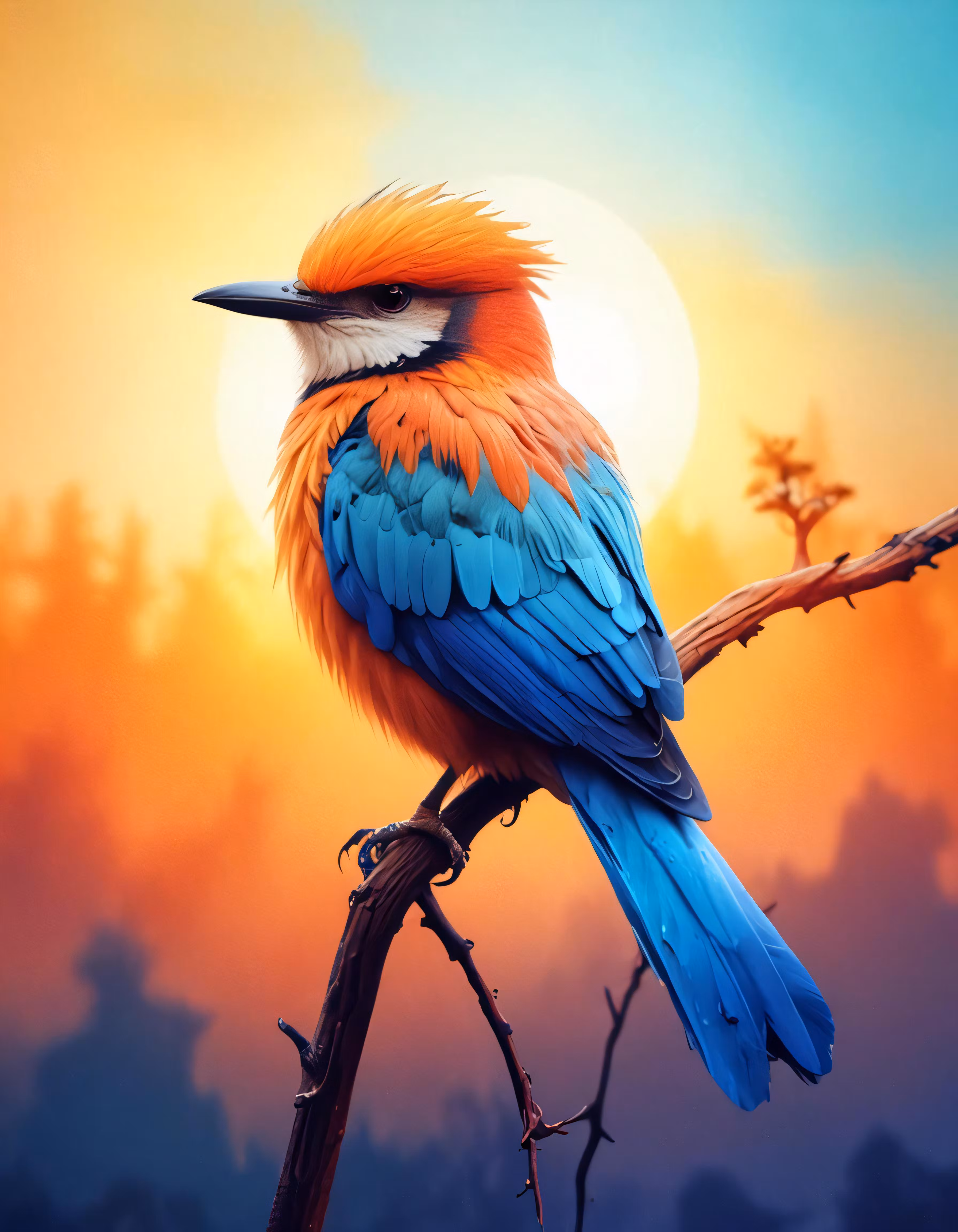 High resolution picture, free to use, a colorful bird on the branch with a sunset in the background