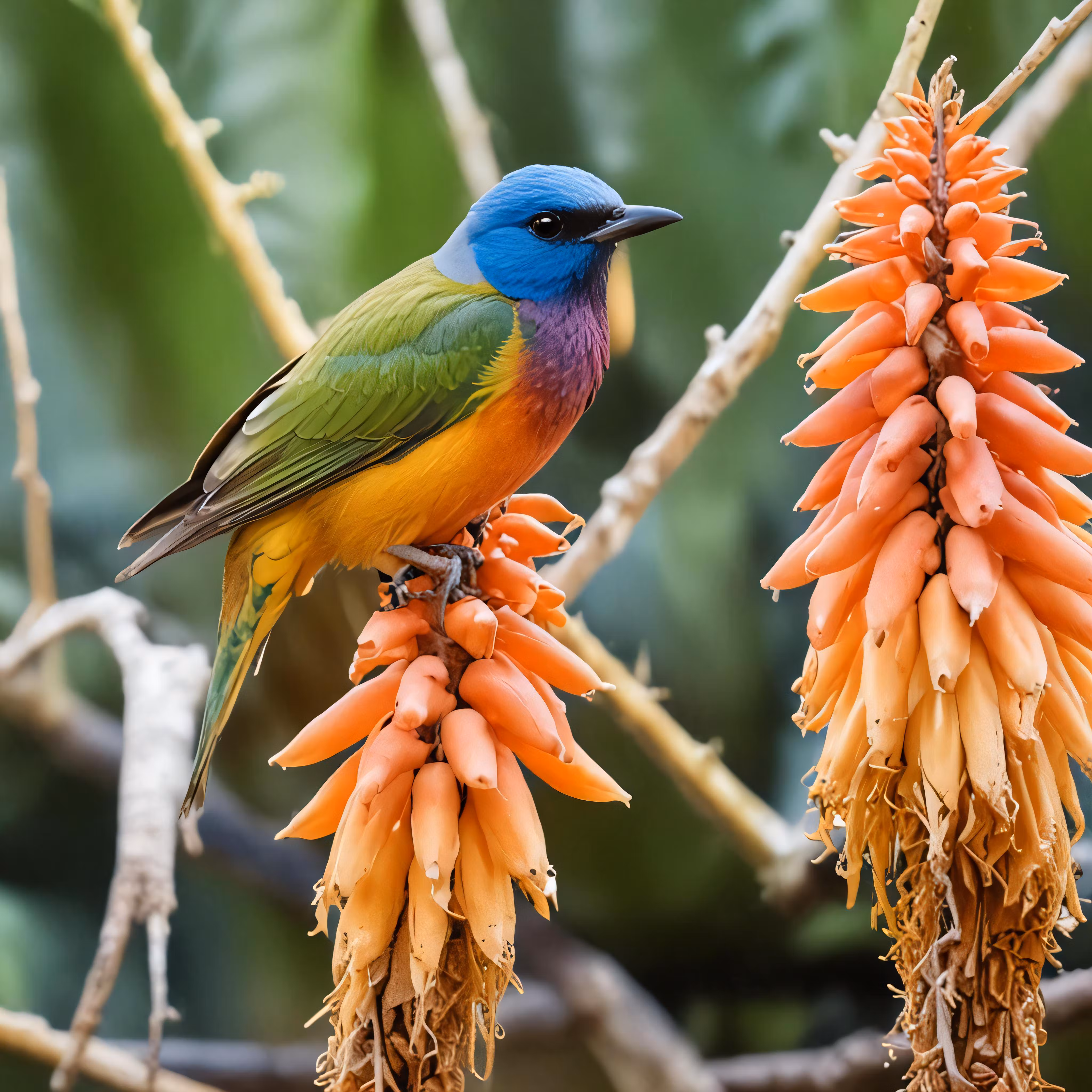 High resolution picture, free to use, a colorful bird sits on top of an orange flower