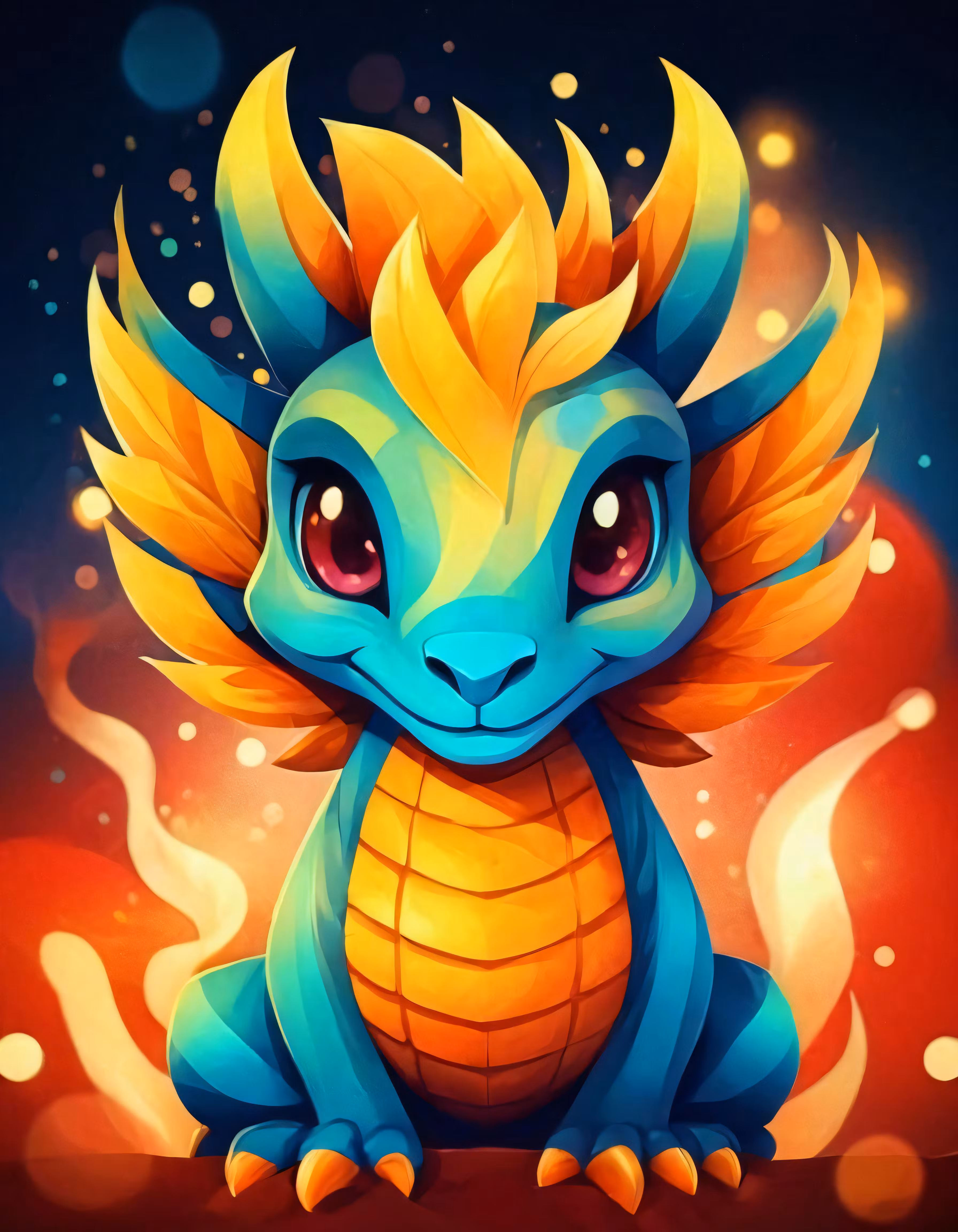 High resolution picture, free to use, a colorful dragon sits on fire