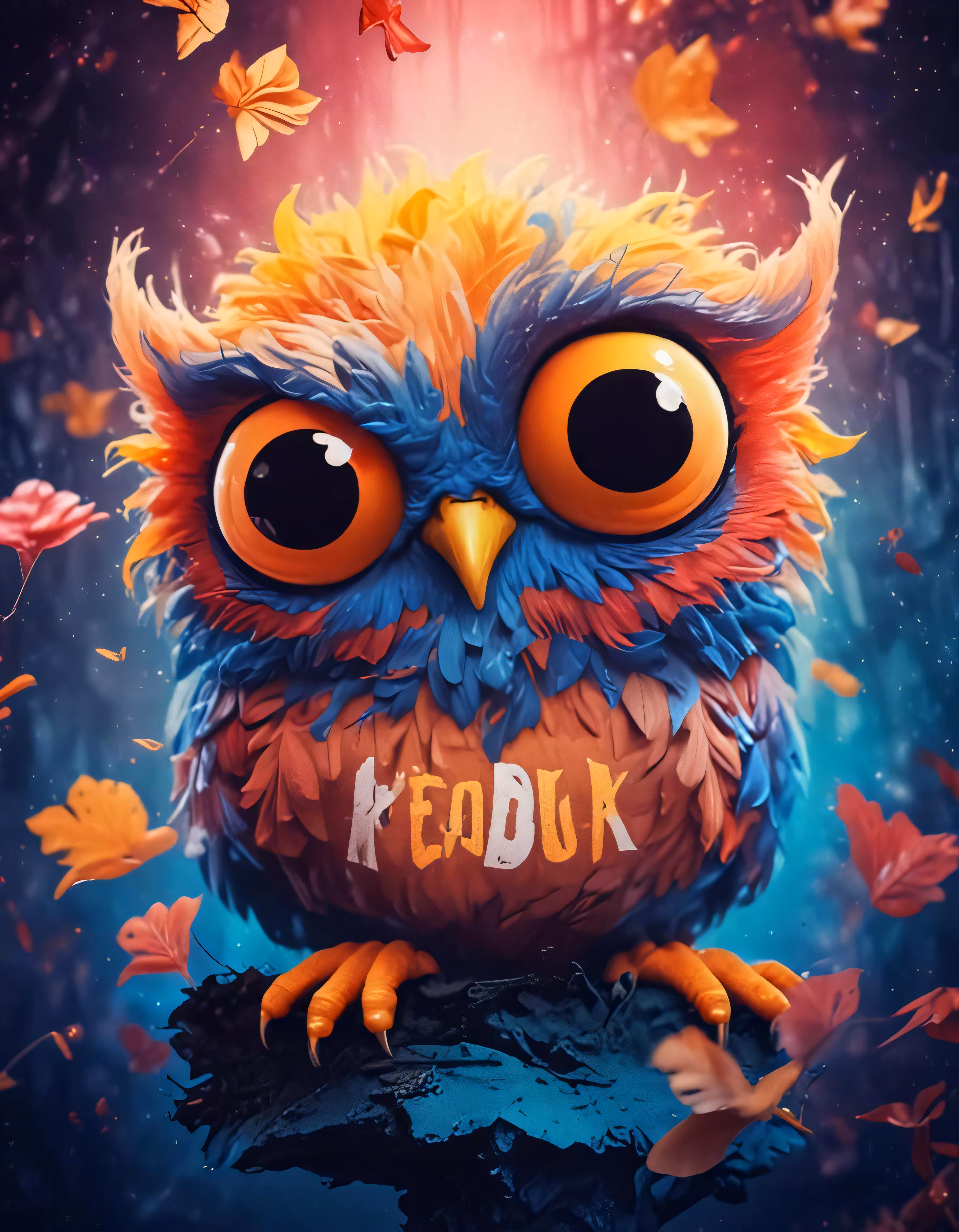 High resolution picture, free to use, a colorful owl with a big eyes and the words reduck spelled on it