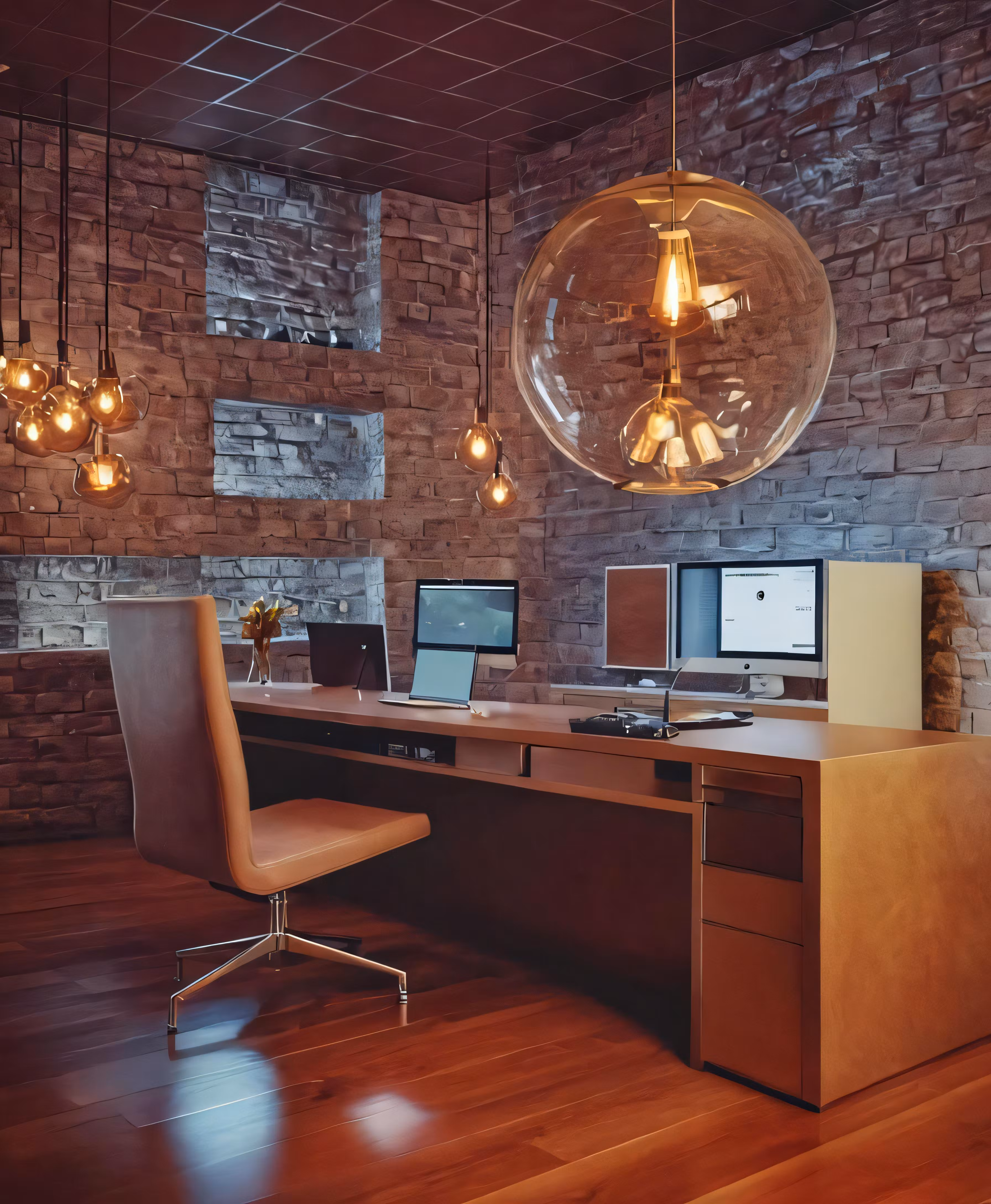 High resolution picture, free to use, a computer desk with a large light bulb hanging over it