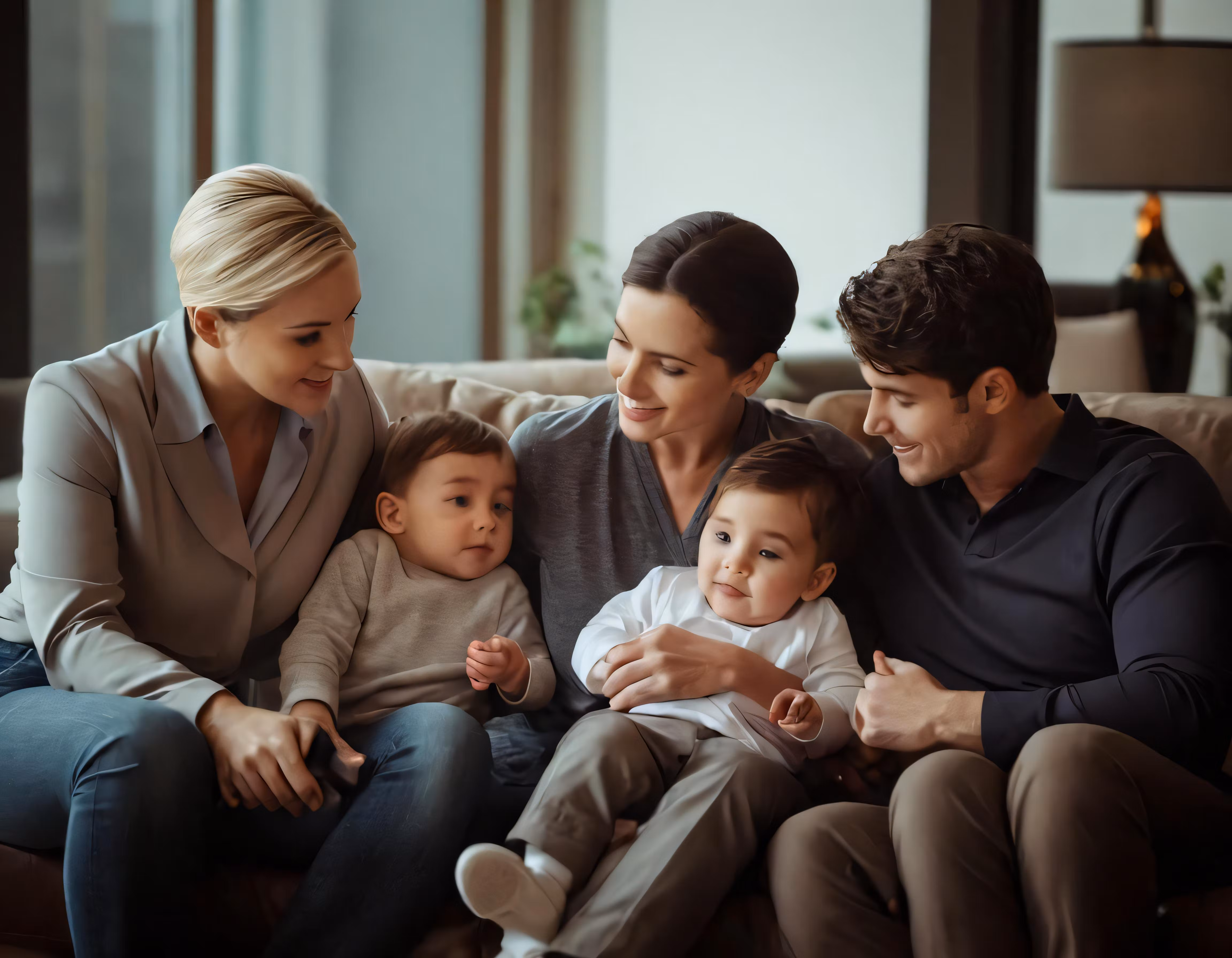 High resolution picture, free to use, a couple, their children, and a baby sitting on the couch