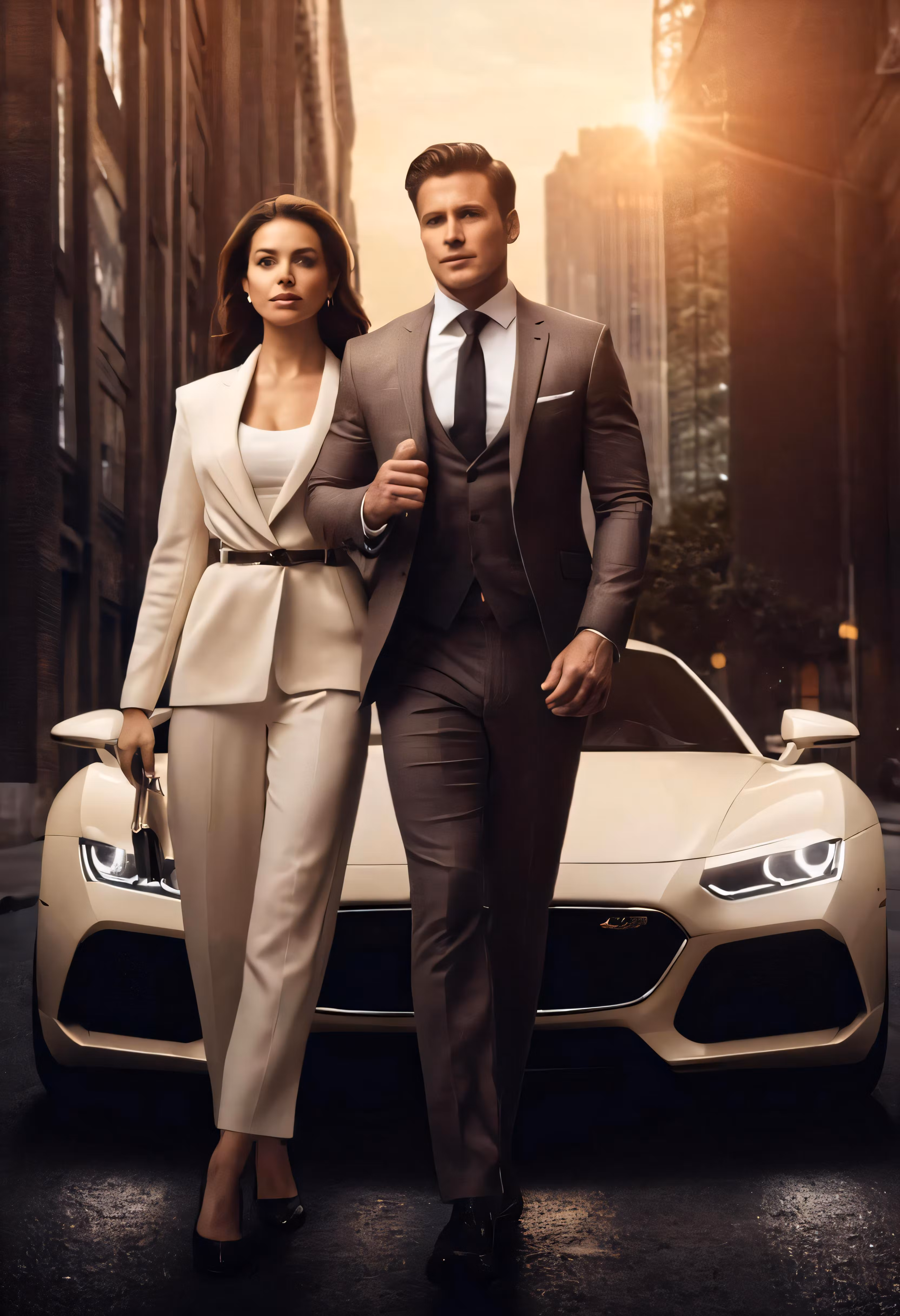 High resolution picture, free to use, a couple in suits standing by a car on the street