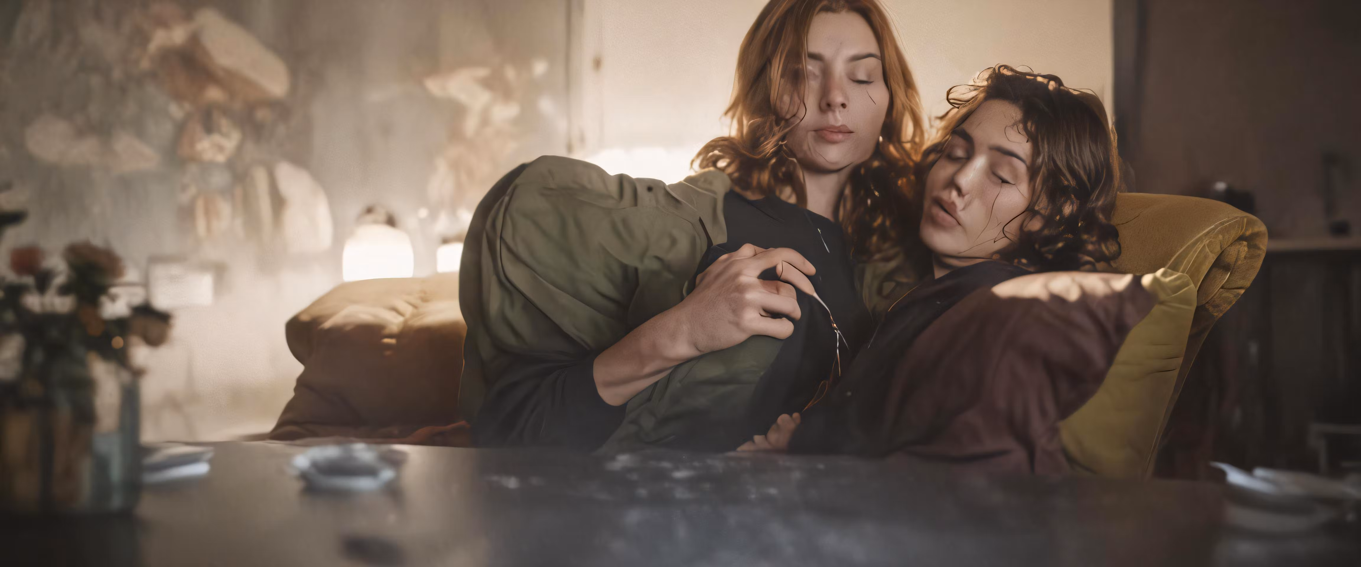High resolution picture, free to use, a couple of young women hugging while sitting on a chair