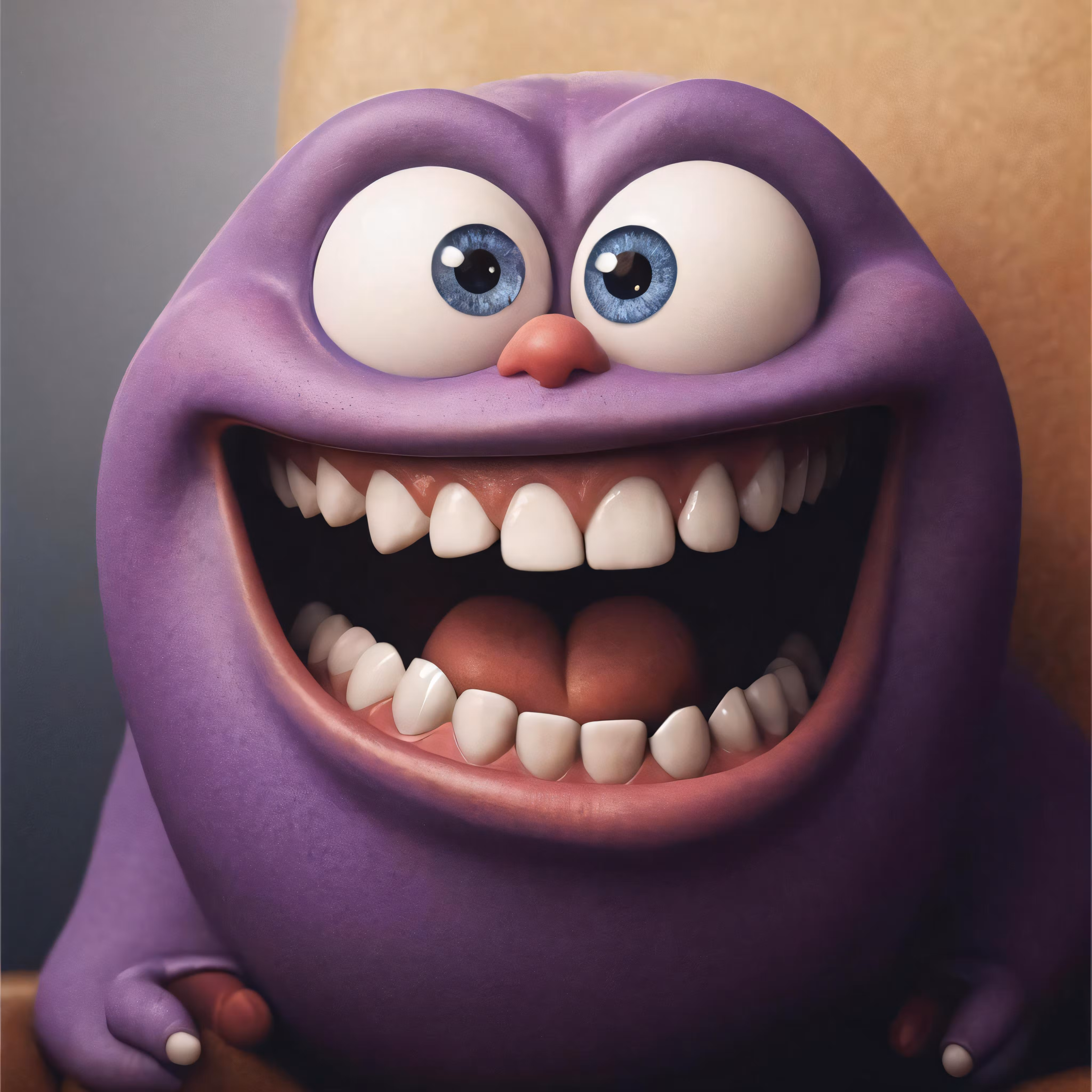 High resolution picture, free to use, a creepy purple creature with blue eyes has big teeth