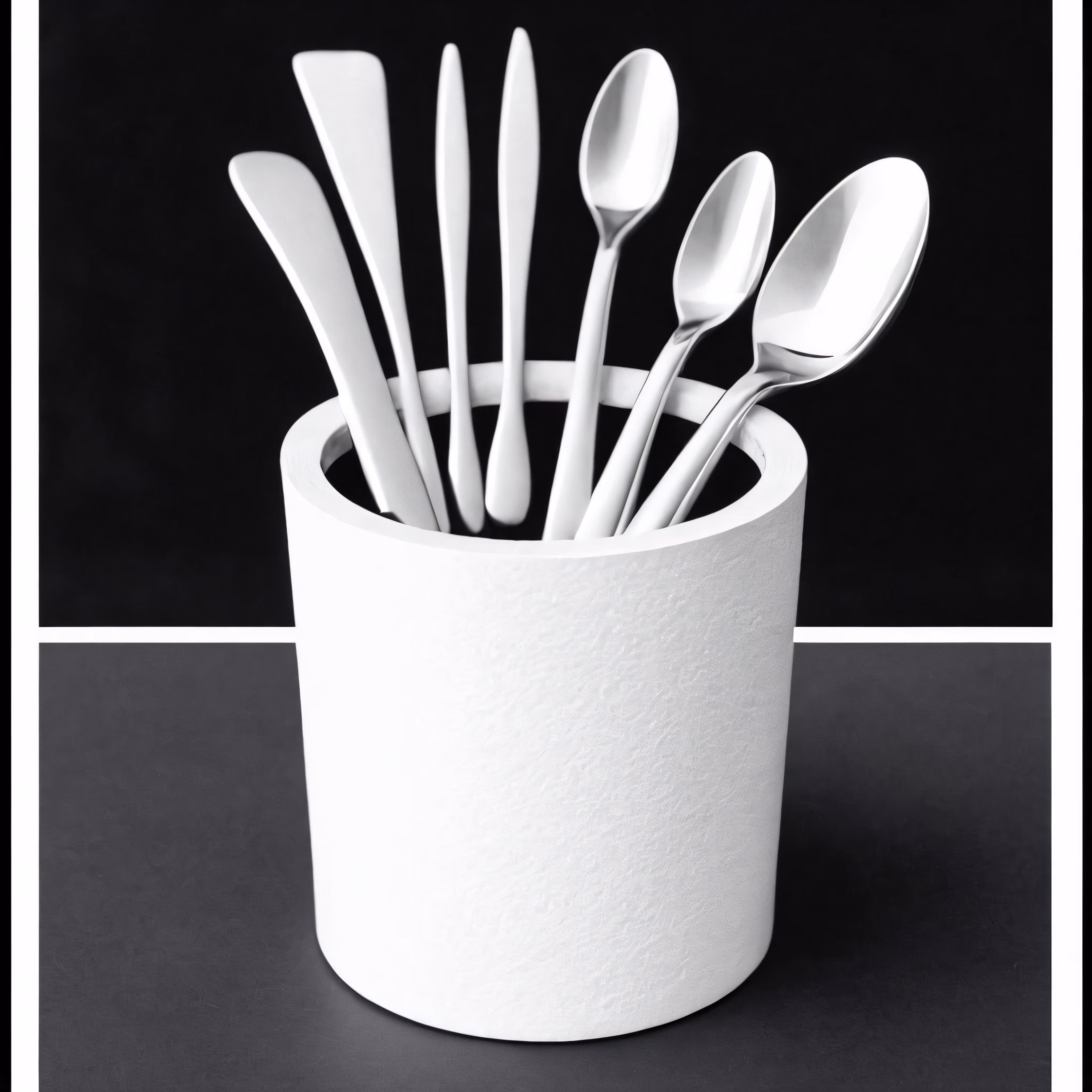 High resolution picture, free to use, a cup full of spoons sitting on top of a counter