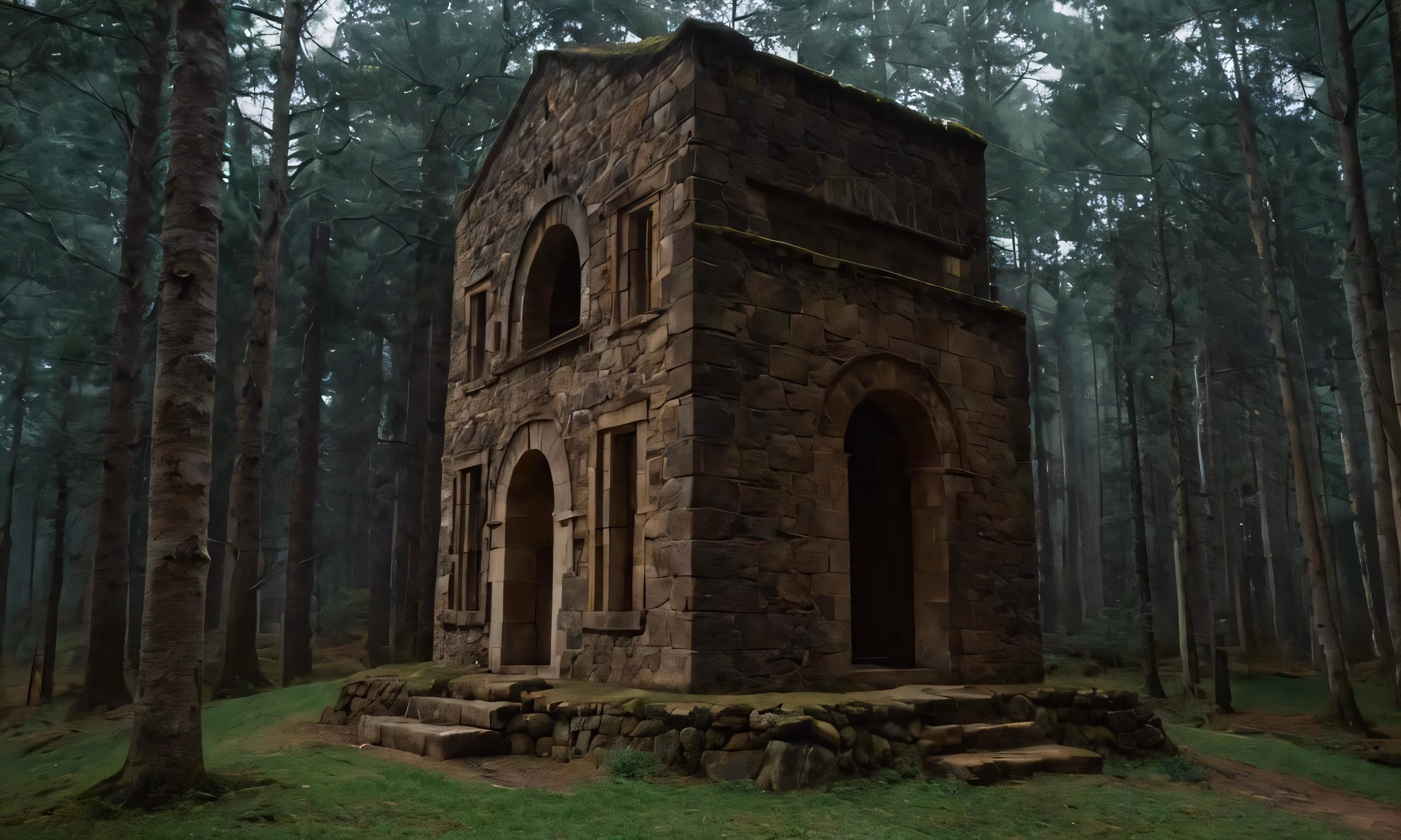High resolution picture, free to use, a dark, deserted and lonely building in a forest