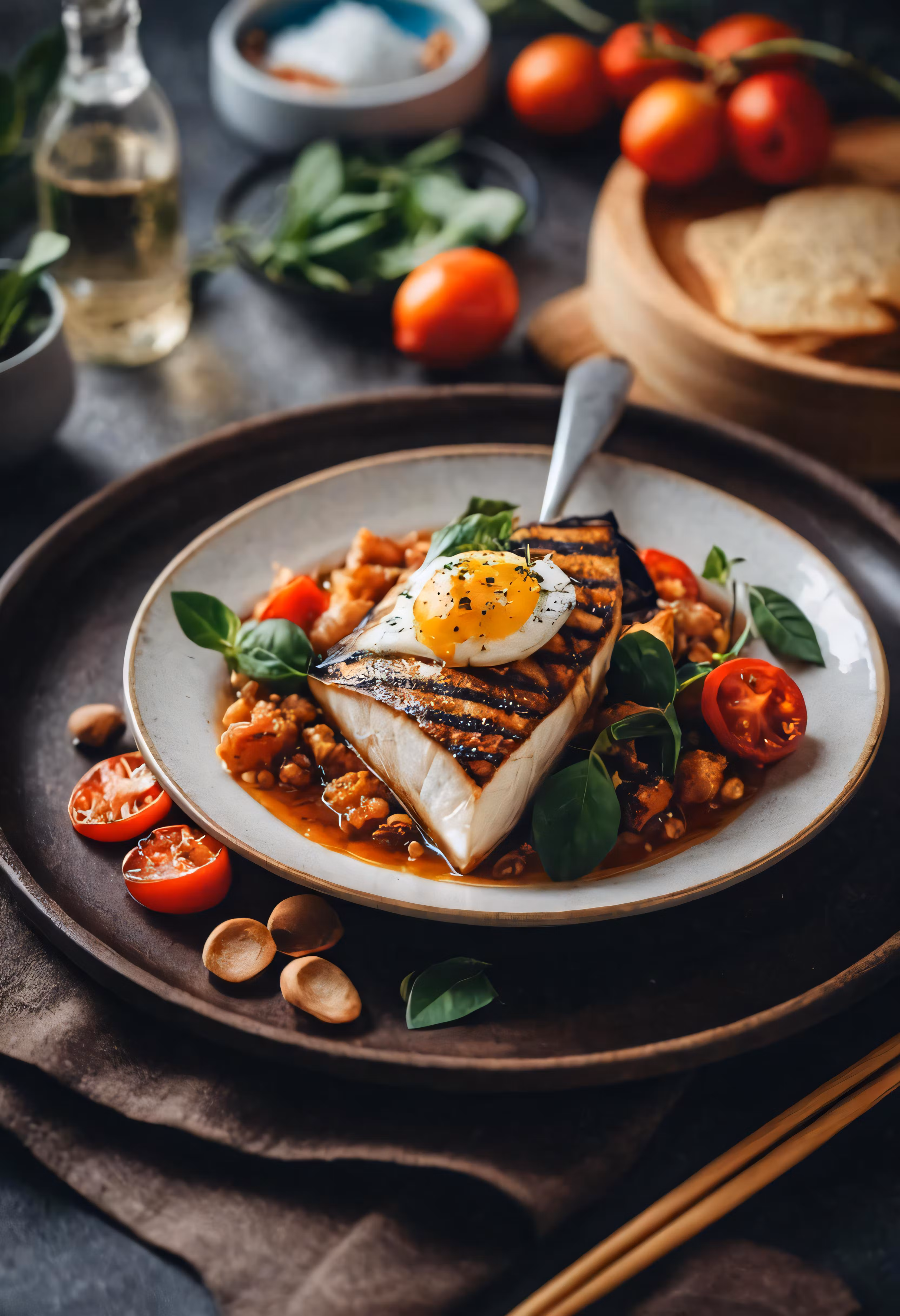 High resolution picture, free to use, a dinner plate with grilled chicken, beans and tomatoes