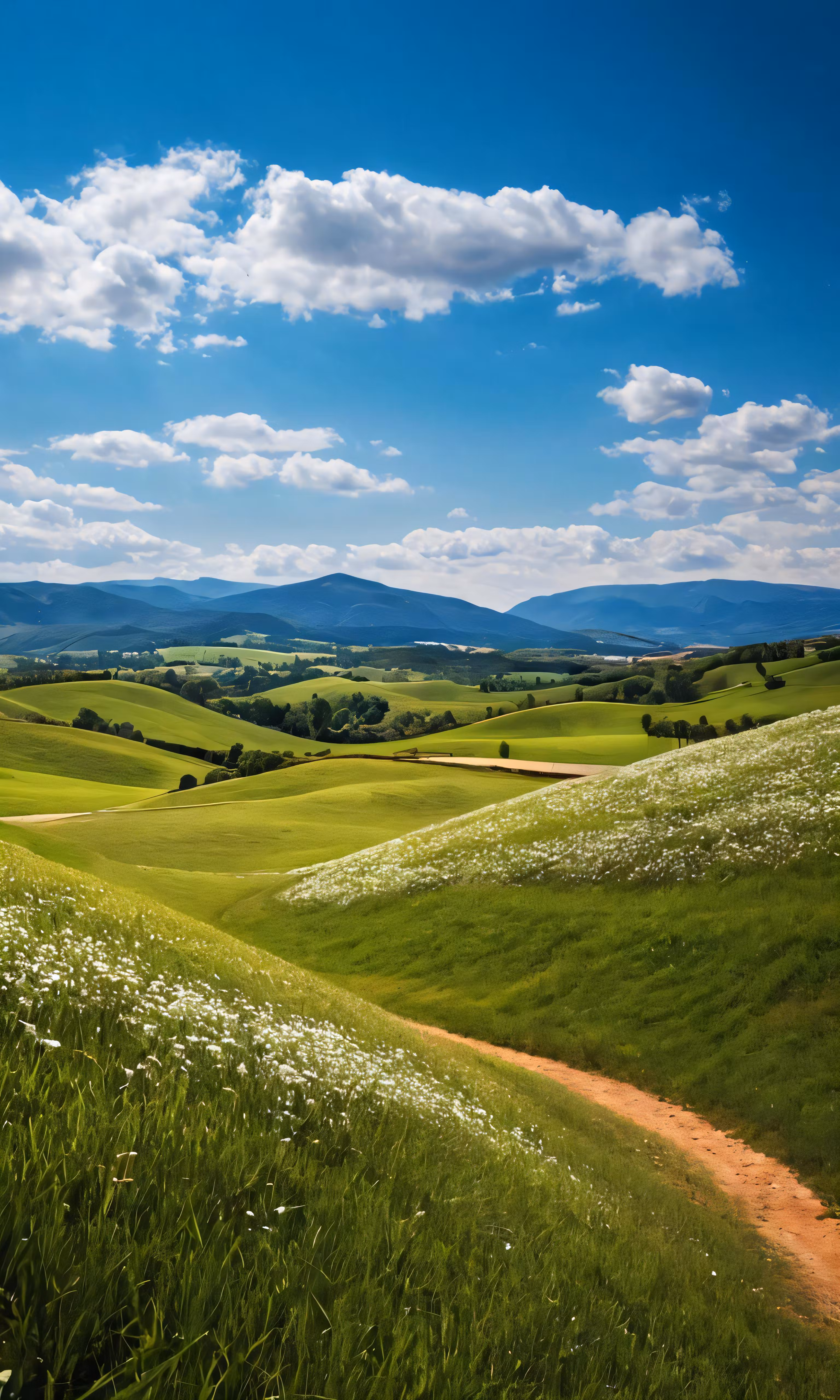 High resolution picture, free to use, a dirt road is near the green rolling hills