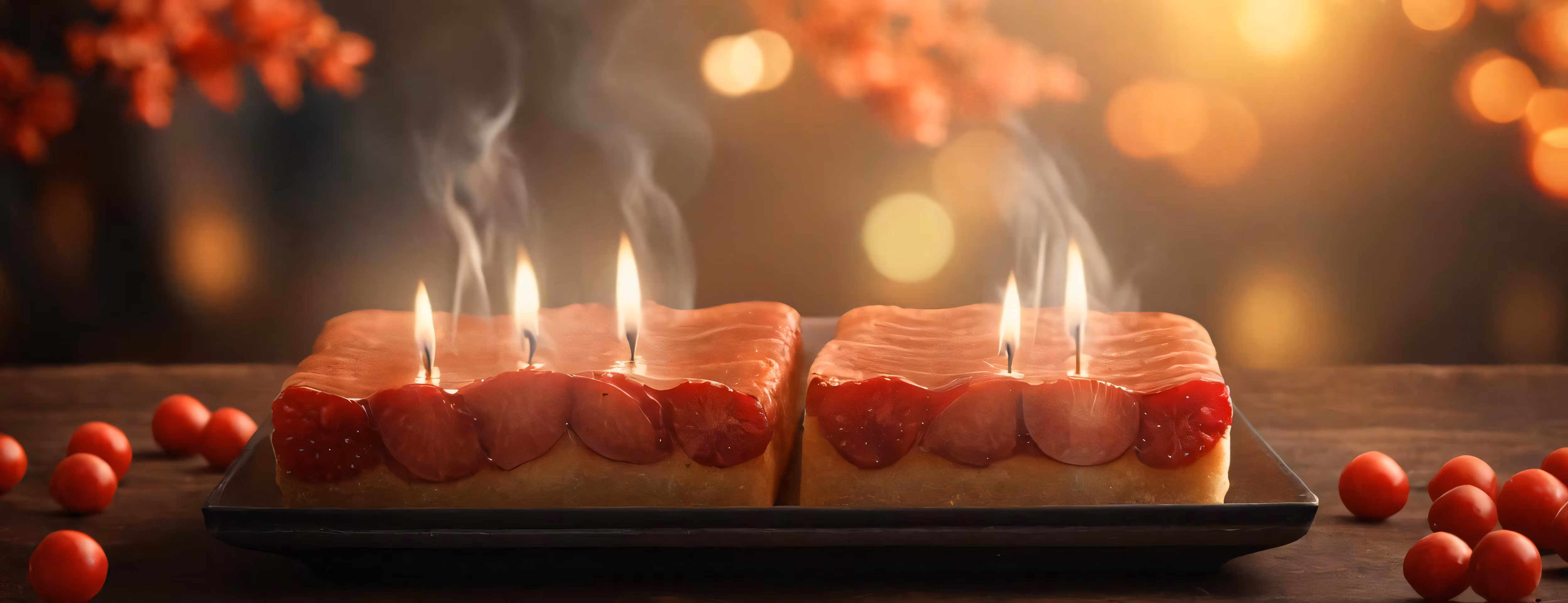 High resolution picture, free to use, a display with candles decorated with red hot sausage
