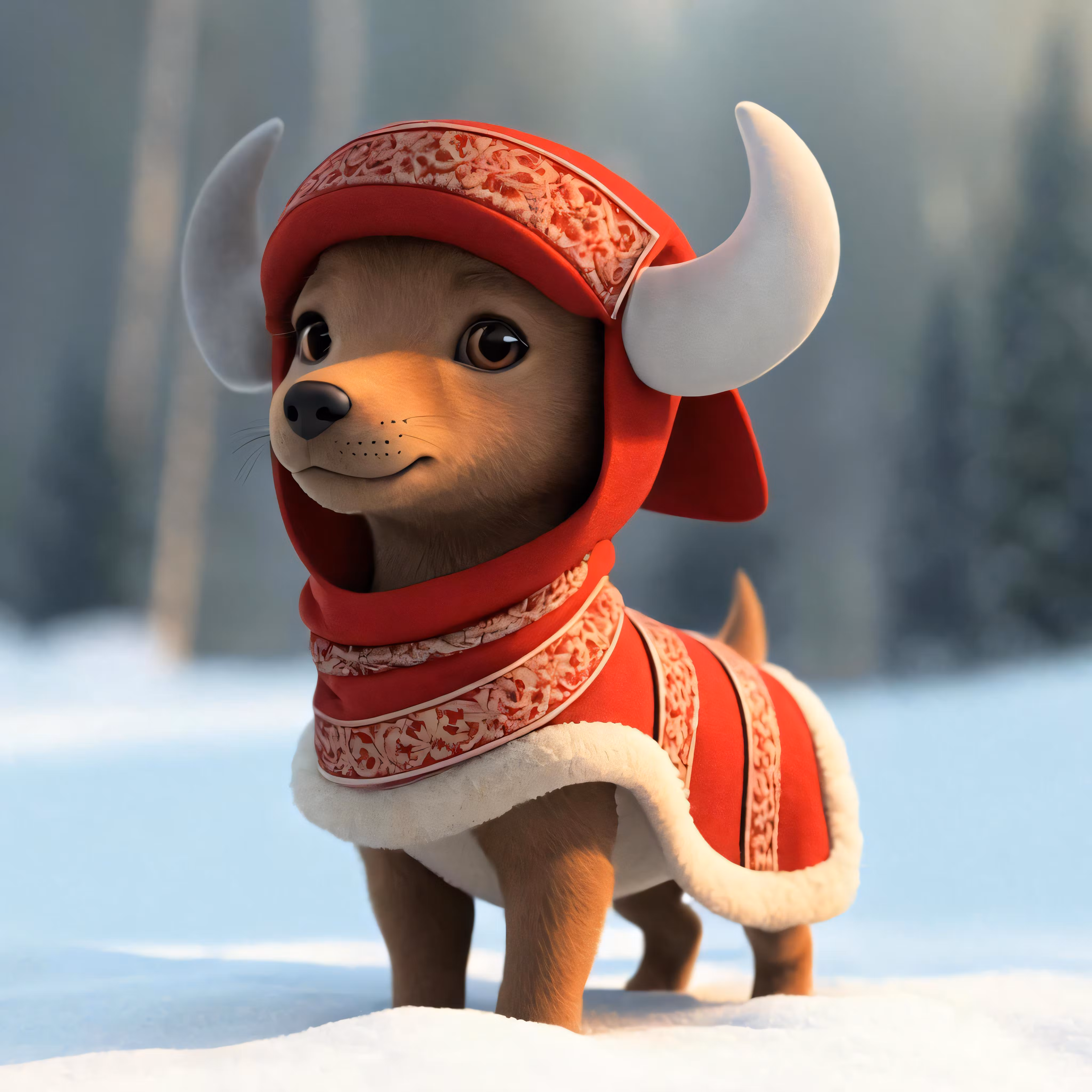 High resolution picture, free to use, a dog dressed up in red clothing stands in snow